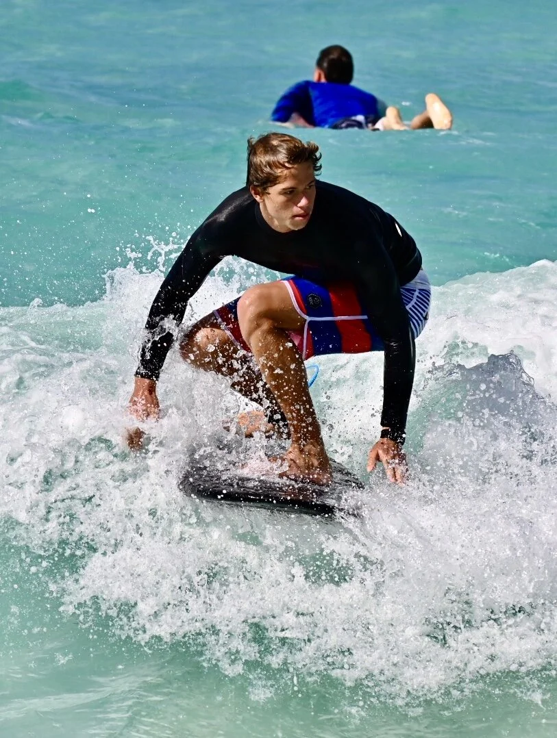 Nach weiteren rund 60 Minuten landen wir an der Mullet Bay, die einigermaßen hohe Wellen haben soll. Und tatsächlich, es knallt mächtig. Die Gewalt des Wassers hat schon ziemlich viel Strand ins Meer gespült. So geht's auch den Badenden, wenn sie nicht aufpassen. Die guten Bedingungen werden von Surfern ausgenutzt. Ich schaue ihnen sehnsüchtig zu. Das hätte ich auch gern mal gekonnt.