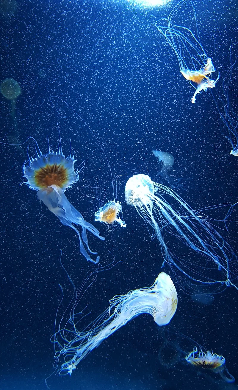 Selbst die Tiere, die ich nicht so gerne am Meer habe, leuchten majestätisch in changierendem blau-weiß. Quallen. Dem Aquarium Berlin soll bisher als einzigem Binnenaquarium die große Kunst gelungen sein, diese empfindlichen Tiere in künstlichem Meerwasser zu züchten. Toll sehen sie aus, aber bitte nur hier und nicht in der Ostsee.