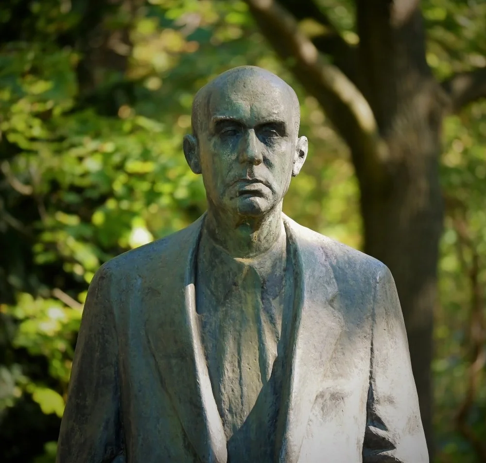 Wem nur „grün“ nicht ausreicht, der kann sich auch eine ganze Reihe von Skulpturen anschauen. Abstrakt, gegenständlich, historisch. So zum Beispiel eine Bronze von Johannes R. Becher. Wikipedia klärt uns auf: Er war ein deutscher expressionistischer Dichter, Minister für Kultur sowie erster Präsident des Kulturbundes der DDR. Bekannt ist er auch als Verfasser des Textes der Nationalhymne der DDR. Ach ja, wir sind in Pankow! Warum er aber so grimmig dreinschaut wissen wir nicht.