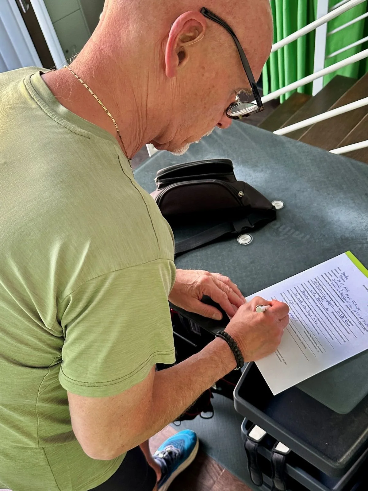 EMS ist die Abkürzung von Elektromyostimulation oder verständlicher: Elektrische Muskelstimulation. Das Prinzip ist einfach. Normalerweise sendet das Gehirn ein elektrisches Signal über das zentrale Nervensystem an den Muskel, damit er sich zusammenzieht. Hier beim EMS-Training übernimmt der Apparat den Effekt. Der Strom kommt über eine Elektrode an den Muskel und lässt ihn ferngesteuert kontrahieren. Für Menschen mit Herzschrittmacher ist das natürlich nichts und deshalb müssen wir zur Sicherheit einen Fragebogen ausfüllen.