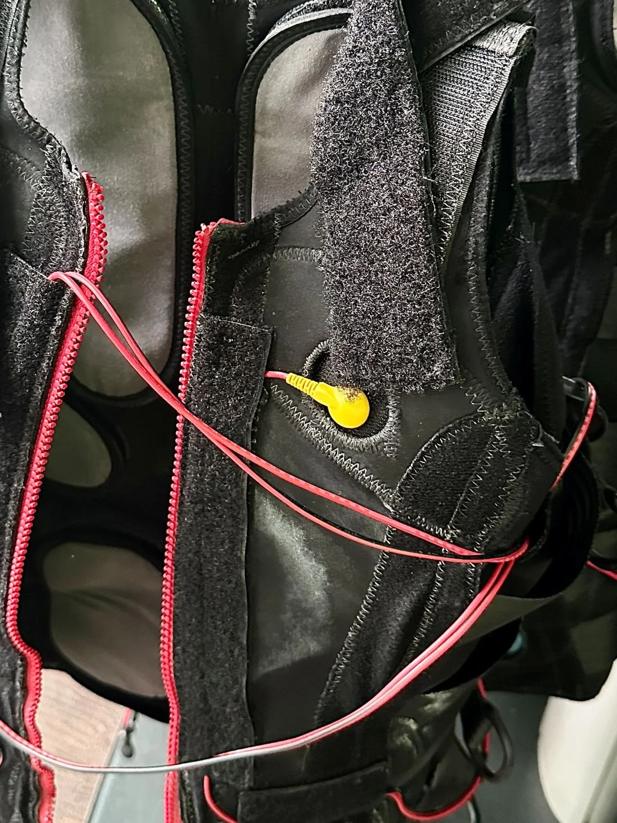 Aber schließlich stehen wir verkabelt in unseren Raumanzügen da und Manuel erklärt uns das Gerät: “Ich gebe Strom auf die einzelnen Muskelgruppen und ihr sagt Stopp, wenn das Kribbeln gerade noch auszuhalten ist!“ Dann kommt für ein paar Sekunden der Impuls und dazwischen für ein paar Sekunden Pause. „Alles klar?“ Wir nicken beide, etwas angespannt.