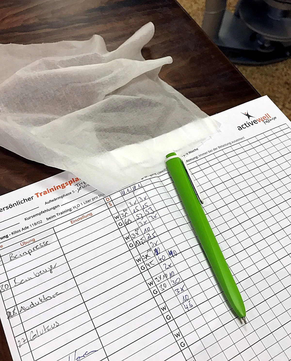 Nach dem dritten Satz mit jeweils zwölf Wiederholungen wechsle ich zur nächsten Station. Nach der Benutzung müssen die Haltegriffe immer desinfiziert werden. Dafür gibt es große Spendersäulen mit Tüchern. Zwischen den Übungen notiert Stefan meine Leistungen.