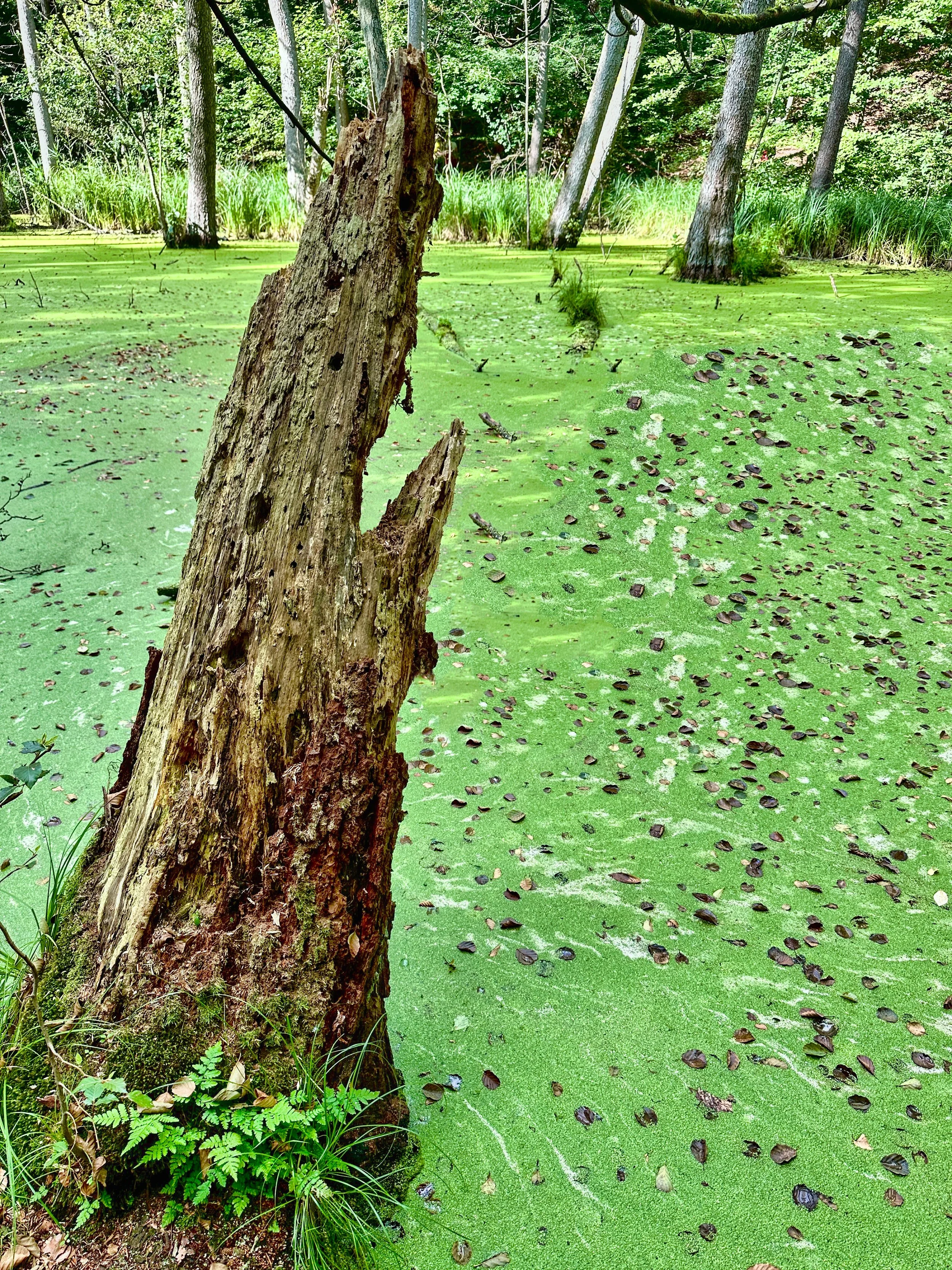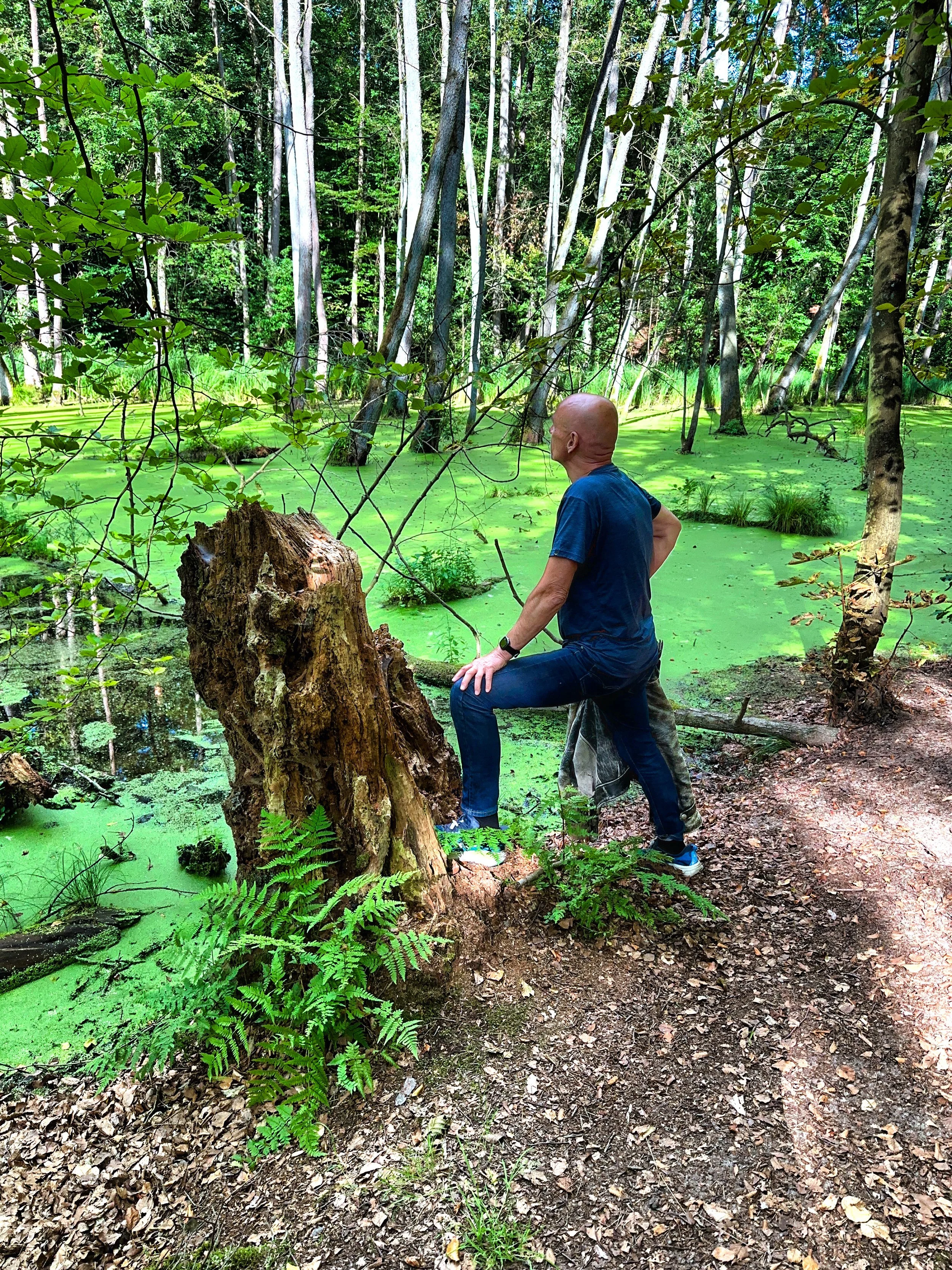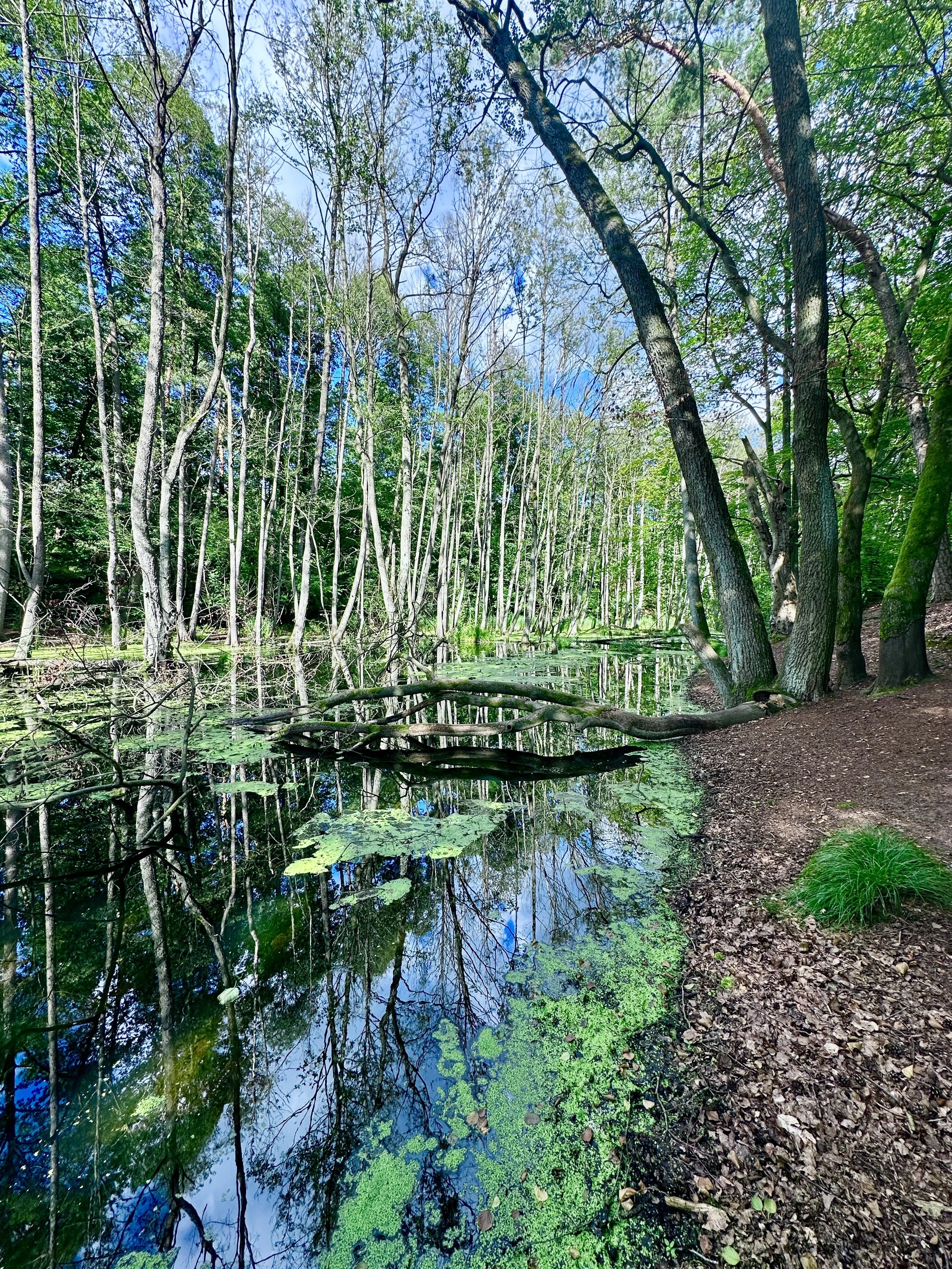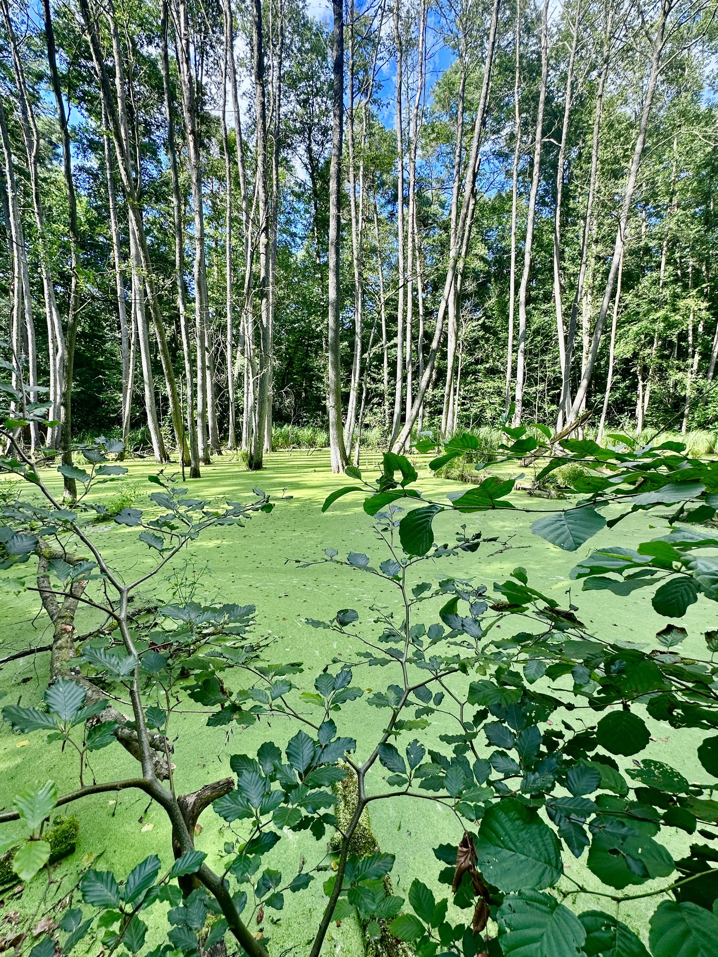 Es ist nicht so abwegig zu behaupten, dass der Briese-Bach aus der Zeit gefallen ist. Geradezu märchenhaft wirkt die Atmosphäre auf mich. Das moosgrüne, von Entengrütze bedeckte Wasser mit den abgestorbenen, knorrigen Baumstümpfen und die himmlische Ruhe sind mystisch. Und unheimlich. Nachts möchte ich hier nicht sein. Und dann zucke ich doch tatsächlich etwas zusammen. Diese eine, direkt vor mir stehende, schräg nach oben ragende Baumleiche wirkt wie ein fabelhaftes, geheimnisvolles Tier, das gerade aus dem Wasser auftaucht. Ein Sumpfdrache, eine Wasserschlange oder der verschwunschene Froschkönig? Es scheint, als ob die Briese ein Geheimnis bewahrt, das nur dem aufmerksamen Wanderer offenbart wird.
