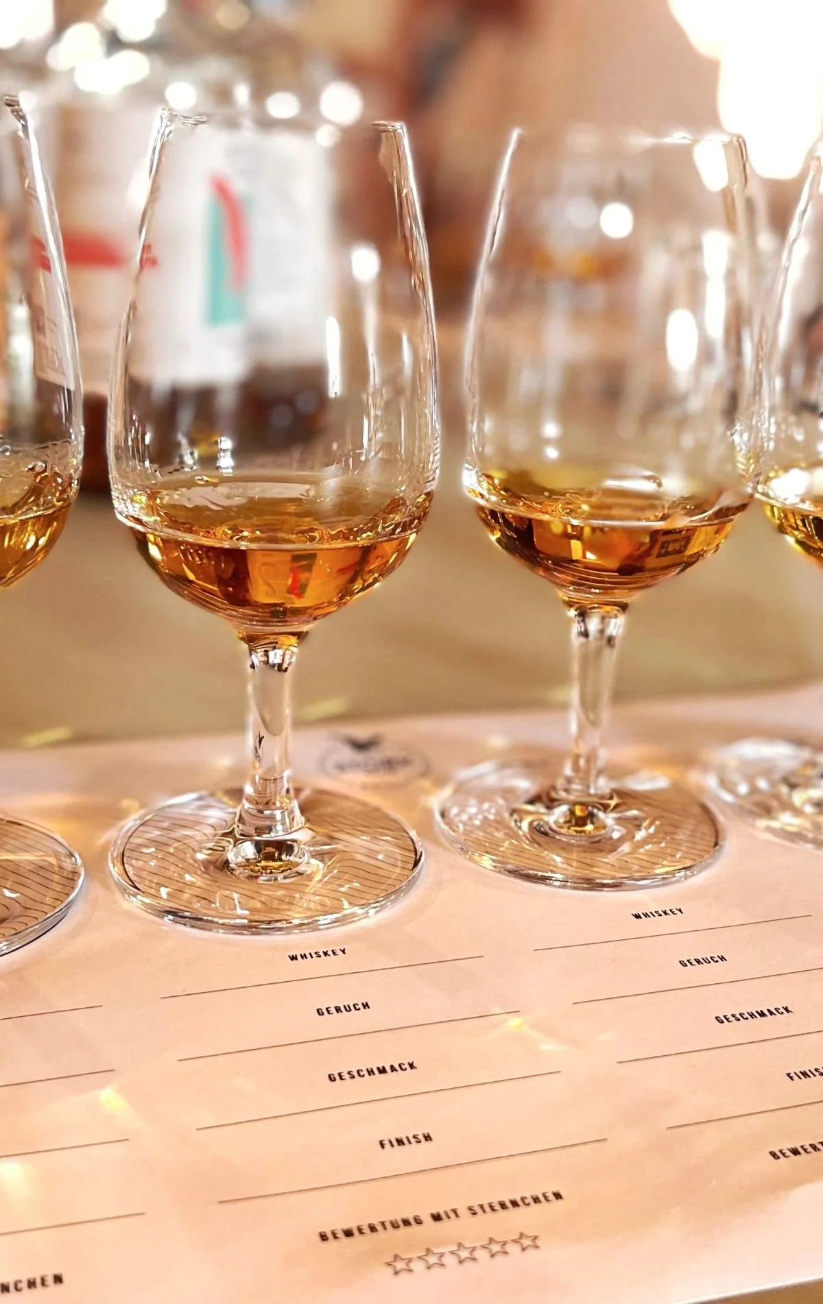 Aber nun ist genug gelernt und geschnuppert, bei der Führung ist auch eine Verkostung mit drin. Ich darf mir vier Gläser füllen und meine Geschmacksknospen reden lassen. Um 12 Uhr mittags zeckt der erste Schluck gewaltig. „Beim zweiten lässt das nach!“, erfahre ich und tatsächlich schmecke ich jetzt Nuancen von Karamell, Schokolade, Grillaromen.