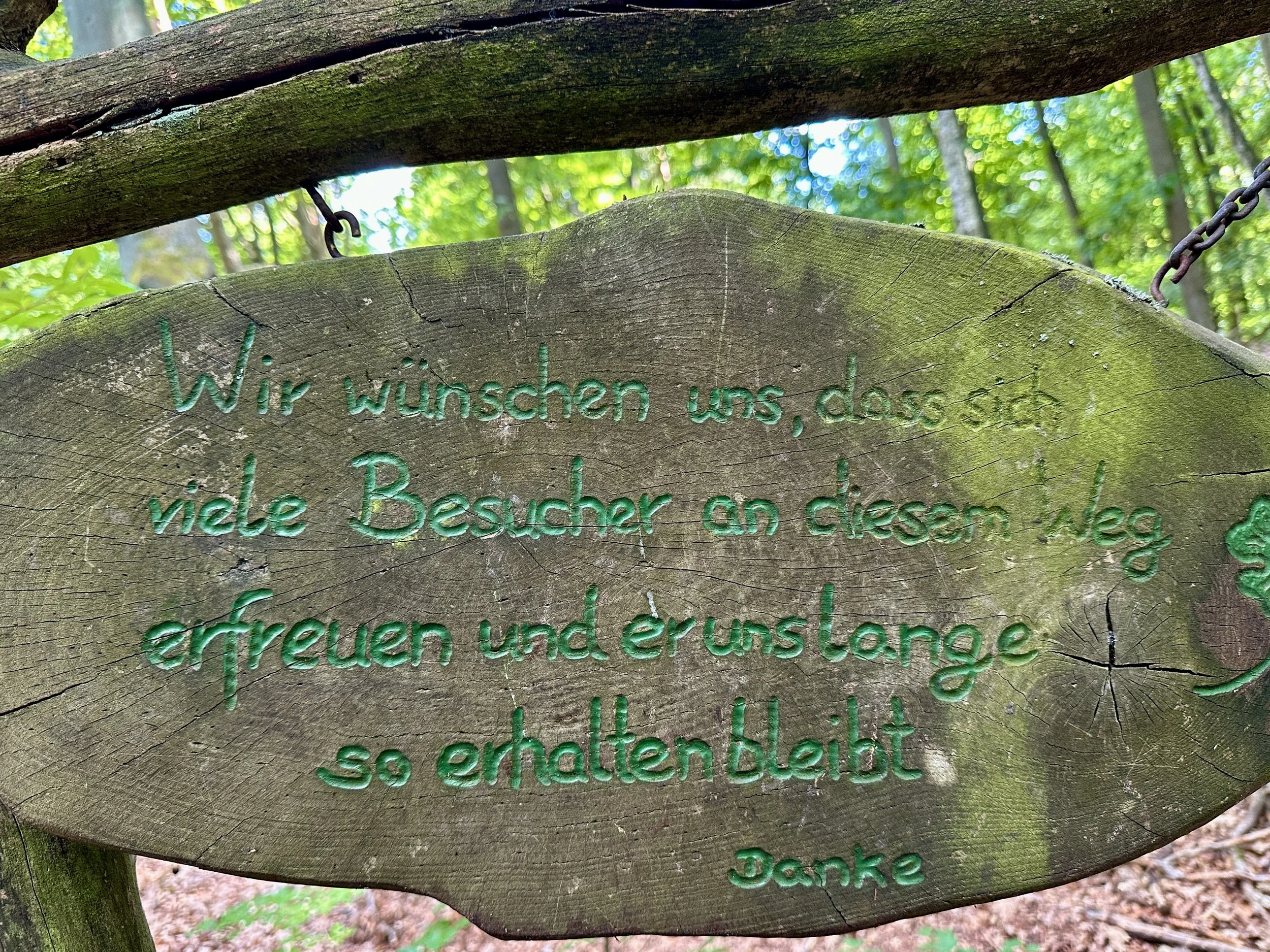 Besonders hübsch ist der Anblick durch die absolute Windstille. Keine noch so kleine Bewegung trübt die perfekten Spiegelungen. Himmel und Wasser verschmelzen zu einem Gesamtkunstwerk. Ich kann mich kaum trennen von diesem Anblick. Über die Brücke könnte ich auf einem Rundweg bis zur Badestelle am Briesesee gelangen. Will ich aber nicht. Da sind bestimmt viele Menschen, hier bin ich allein. Außerdem könnte ein böser Zauber mit dem Queren der Holzbohlen verbunden sein. Ich bleibe lieber auf dieser Seite und gehe jetzt nach oben zum Wanderweg. Dort hängt ein Schild mit einem frommen Wunsch, dem ich mich mit aller Inbrunst anschließe.