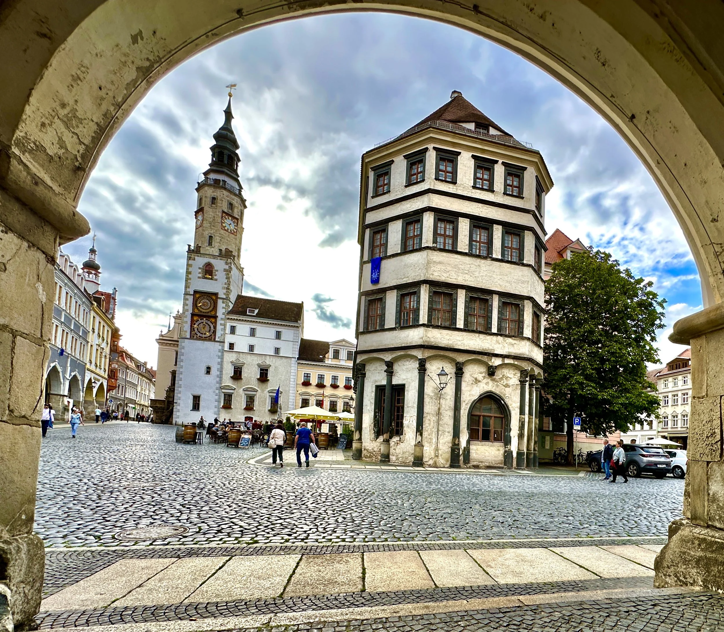 Im Haus „Der braune Hirsch“ hieß es öfter mal: „Film ab!“ – von „Der Zauberlehrling“ über „Der junge Karl Marx“ bis „Die Vermessung der Welt“. In den Arcaden stehend, habe ich einen prachtvollen Blick auf das Rathaus und „Die Waage“. Hier wurden Waren gewogen und es wurde jede Menge Geld von den Händlern kassiert, die die „Via Regia“ von der Neiße hochkamen.