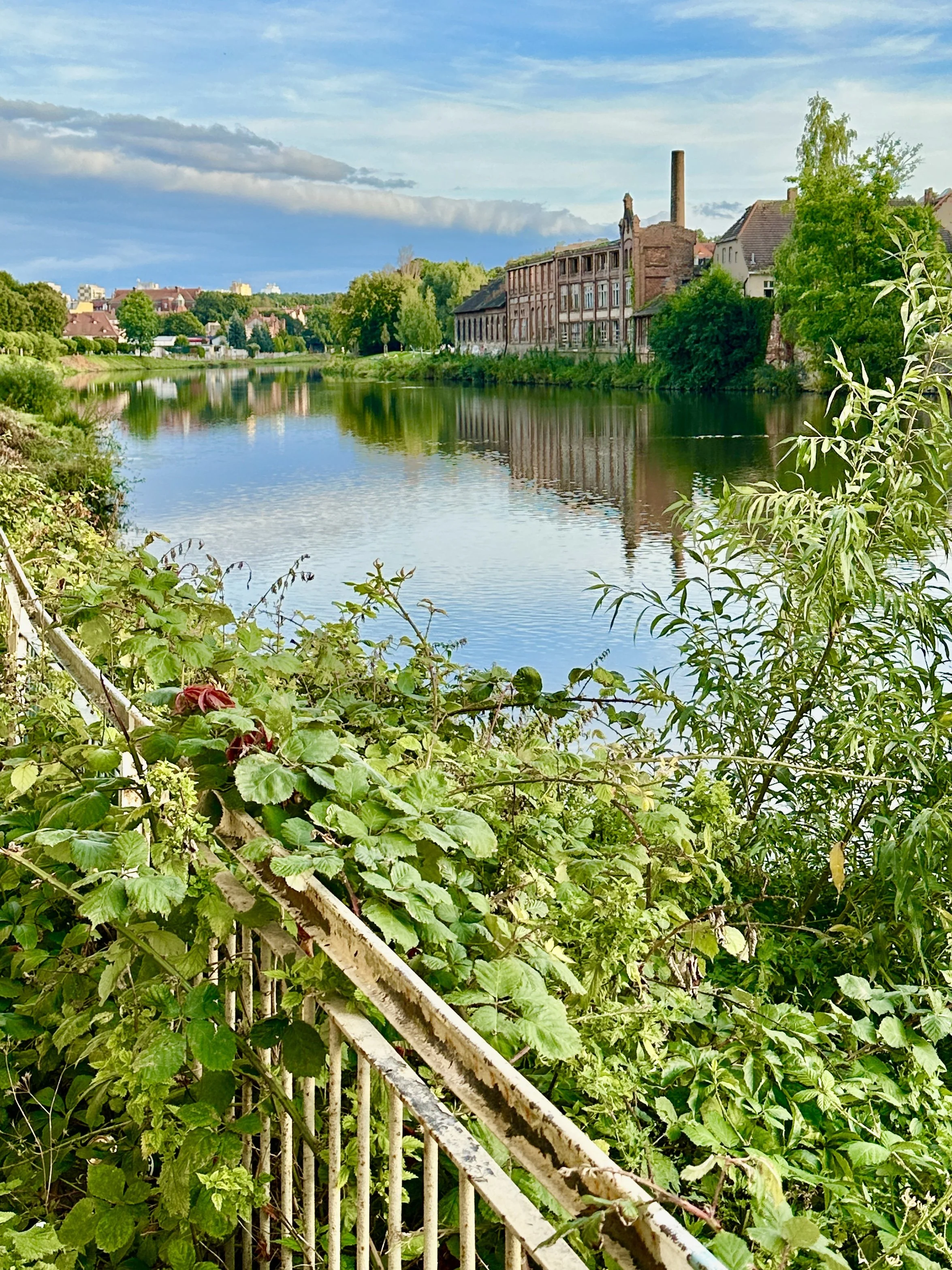 Noch ein Abstecher runter zum Wasser. Ich verweile etwas, denke über die deutsch-polnische Geschichte nach und genieße den grünen Blick die Neiße hinunter: In der Ferne die Einfamilienhäuser und noch ein Stück weiter die Plattenbauten des Viertels, das tatsächlich „Manhattan“ heißt.