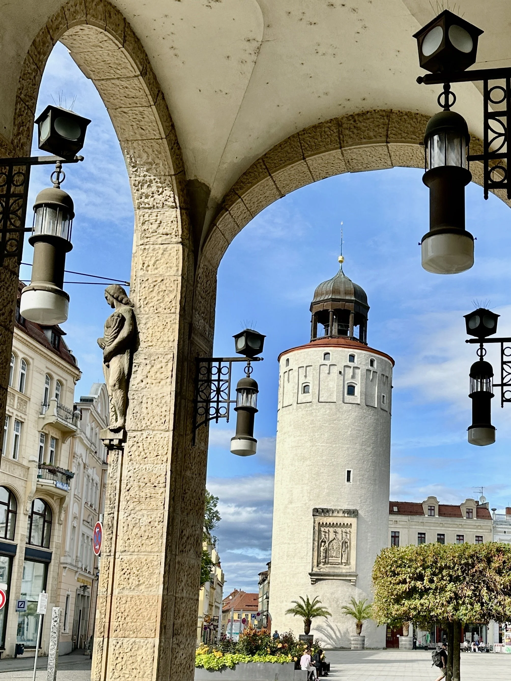 Über den Demianiplatz, vorbei am Gerhart-Hauptmann-Theater, gelangen wir zum „Dicken Turm“ am Marienplatz. Mauern: fünf Meter dick. Von den Kolonnaden des geschlossenen Kaufhauses „Zum Strauss“ habe ich einen genialen Blick.