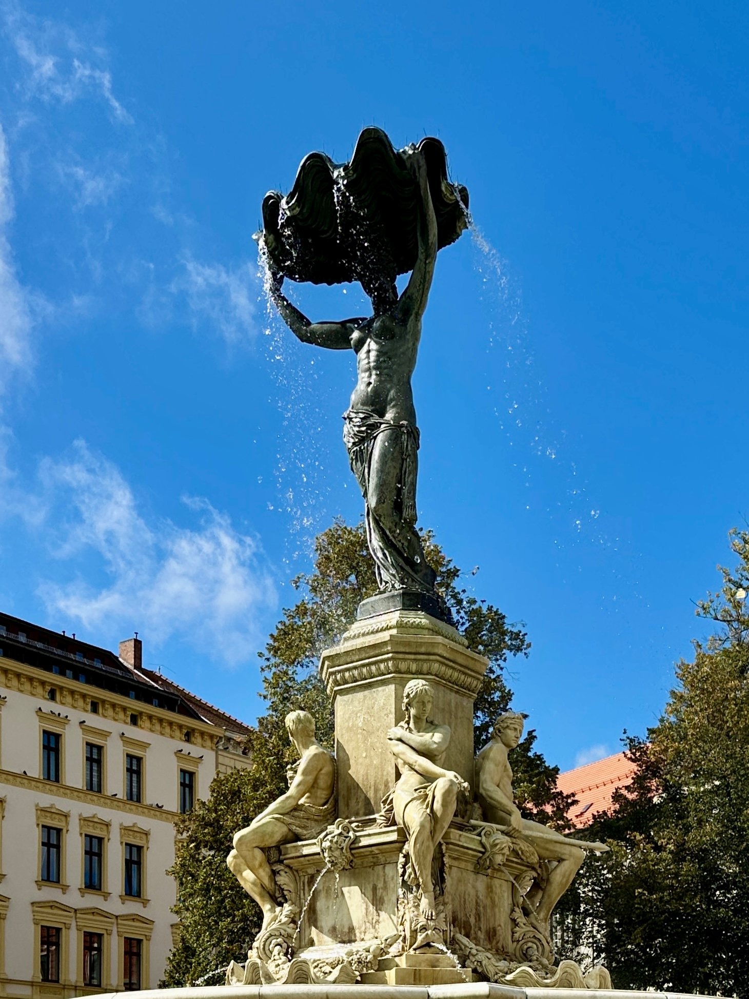 Das Kaufhaus selbst wurde vom jüdischen Kaufmann Louis Friedländer nach Berliner Vorbild gebaut; meine Heimatstadt lässt grüßen. Ein echtes Einzelstück seiner Epoche. Gleich daneben steht die Frauenkirche; für eine Besichtigung ist jetzt aber keine Zeit. Rechte Hand öffnet sich der Postplatz. In der Mitte steht der Brunnen mit der berühmten „Muschelminna“ – offiziell Flora, Göttin der Natur. Der Volksmund ist da oft treffender und die Spitznamen einfach Kult.