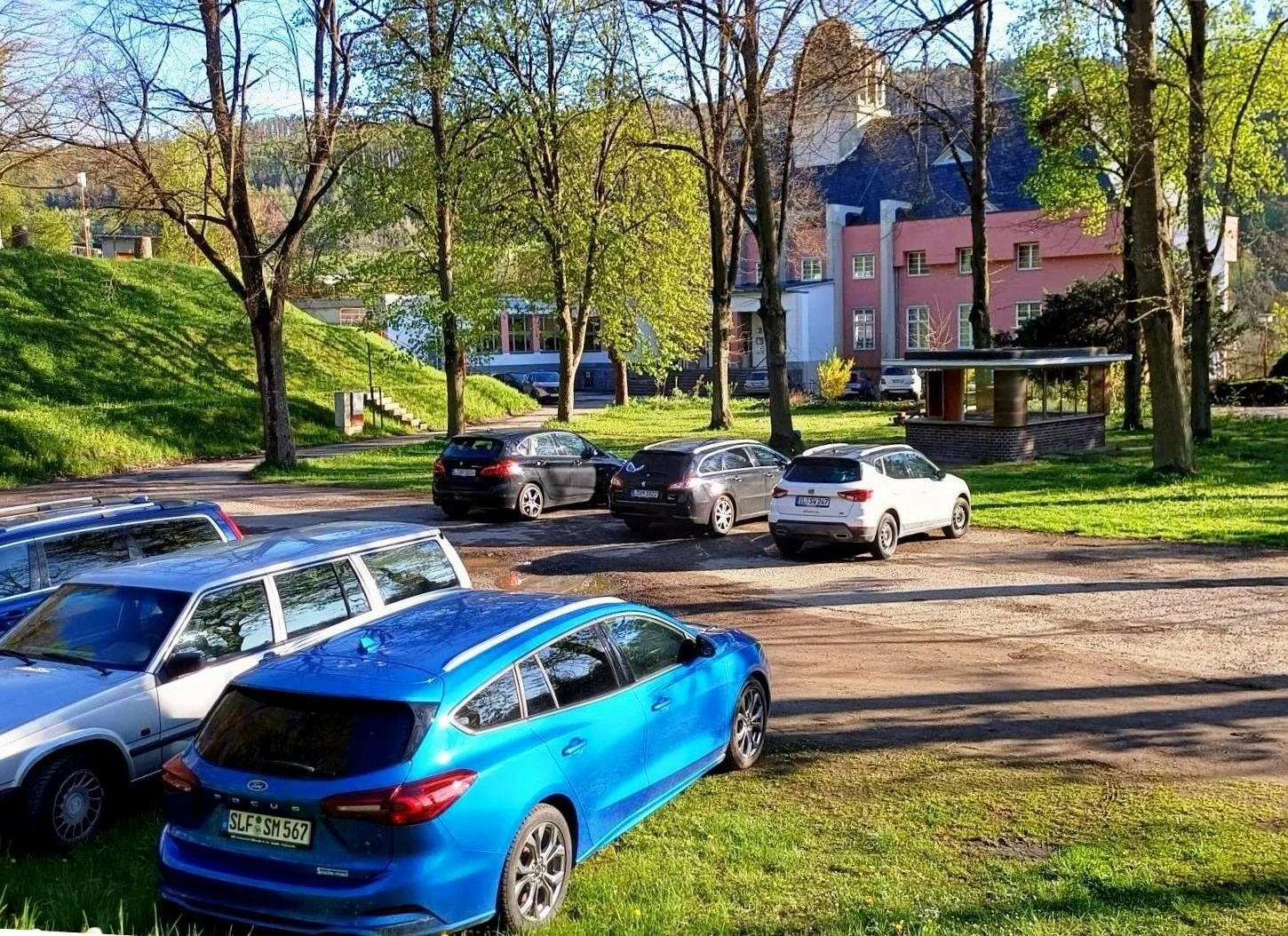 Hier befinden sich die Einfahrt und das riesige terrassierte Park-Areal. Heute ist ein Teil davon Parkplatz der Gäste im „Haus des Volkes“.