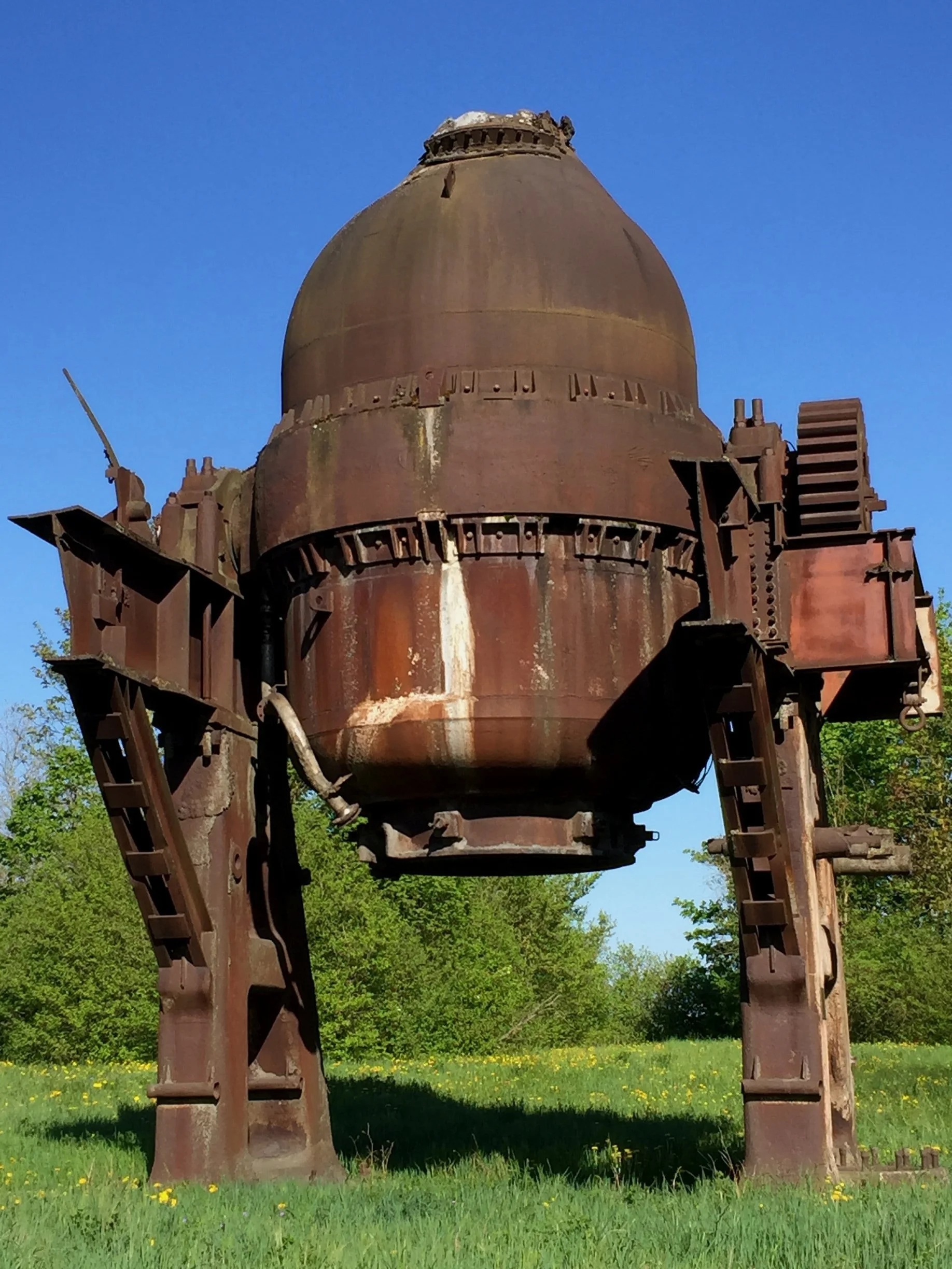 Auf dem Außengelände verabschiedet uns ein riesiger Stahl-Sauerstoff- Konverter, der wie ein bauchiger laufender Roboter ausschaut.