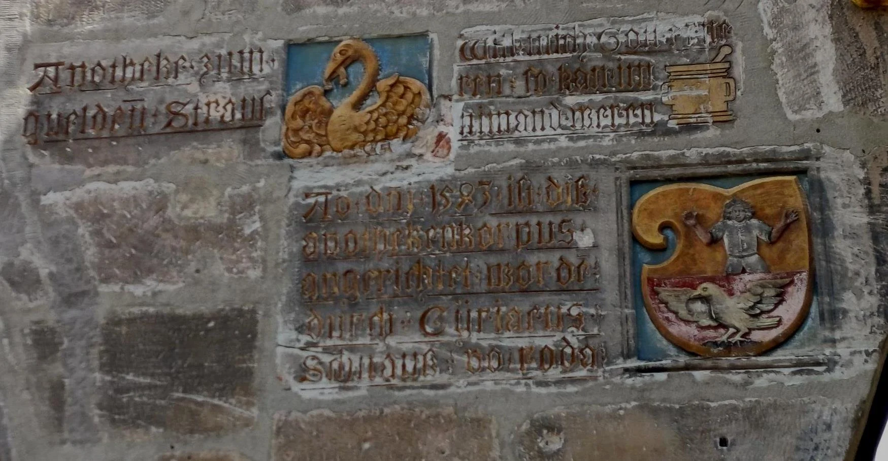 Wo man hinschaut, erzählen die Gebäude ihre Historie. Auch wenn die Apotheke am Marktplatz heute Hof-Apotheke heißt, wird an der Hauswand ein anderes Narrativ erwähnt. Das charakteristische Gebäude wird bereits seit 1543 als Apotheke genutzt und hieß ursprünglich „Zum güldenen Strauß“. Cyriakus Schnauß (1512–1571) eröffnete hier die erste städtische Apotheke.