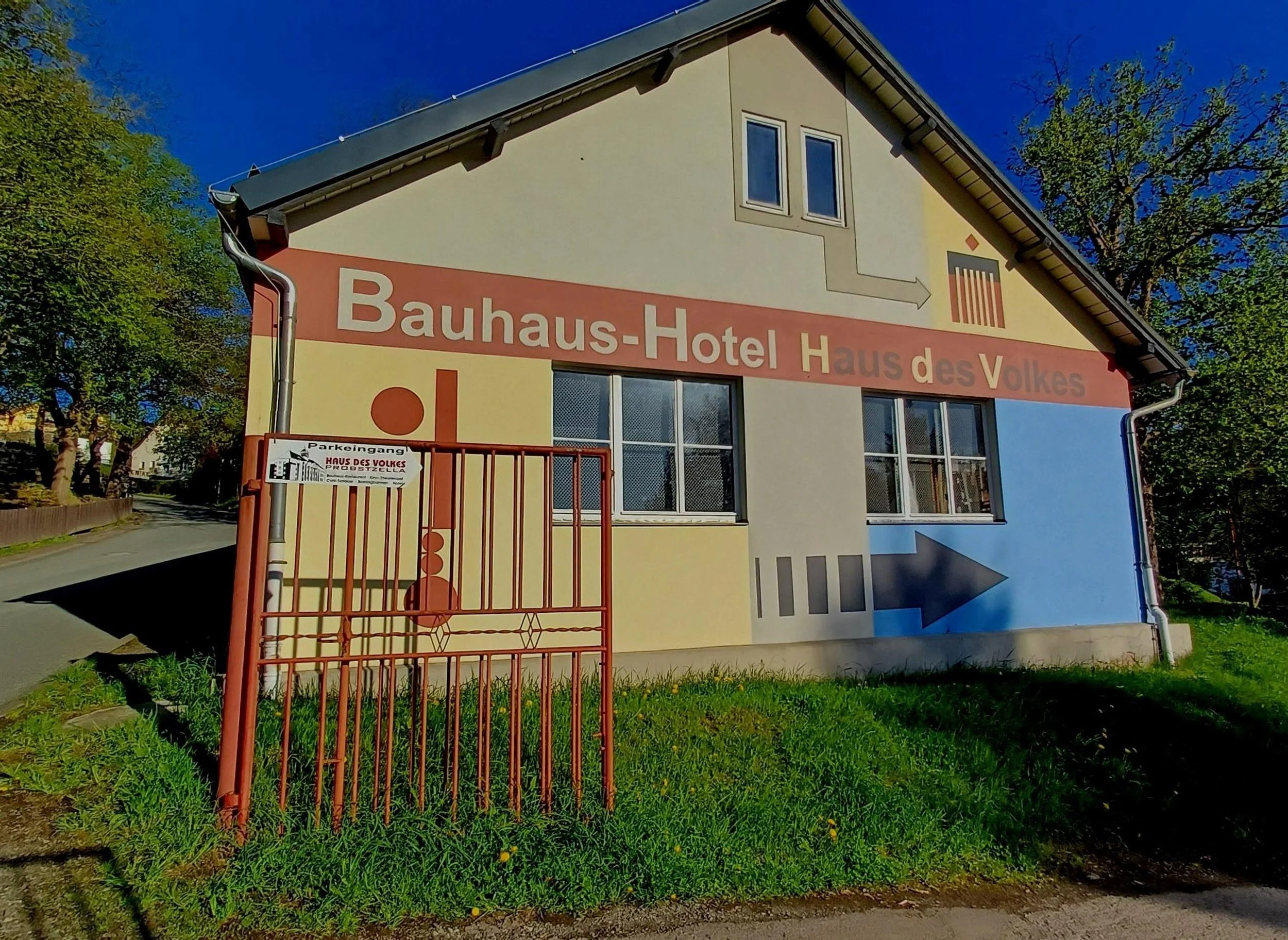 Zum gesamten Bauhaus-Ensemble „Haus des Volkes“ gehört auch noch ein benachbarter Garagenbau. Der Bau wurde teilweise aufgestockt und mit einem Pultdach versehen.