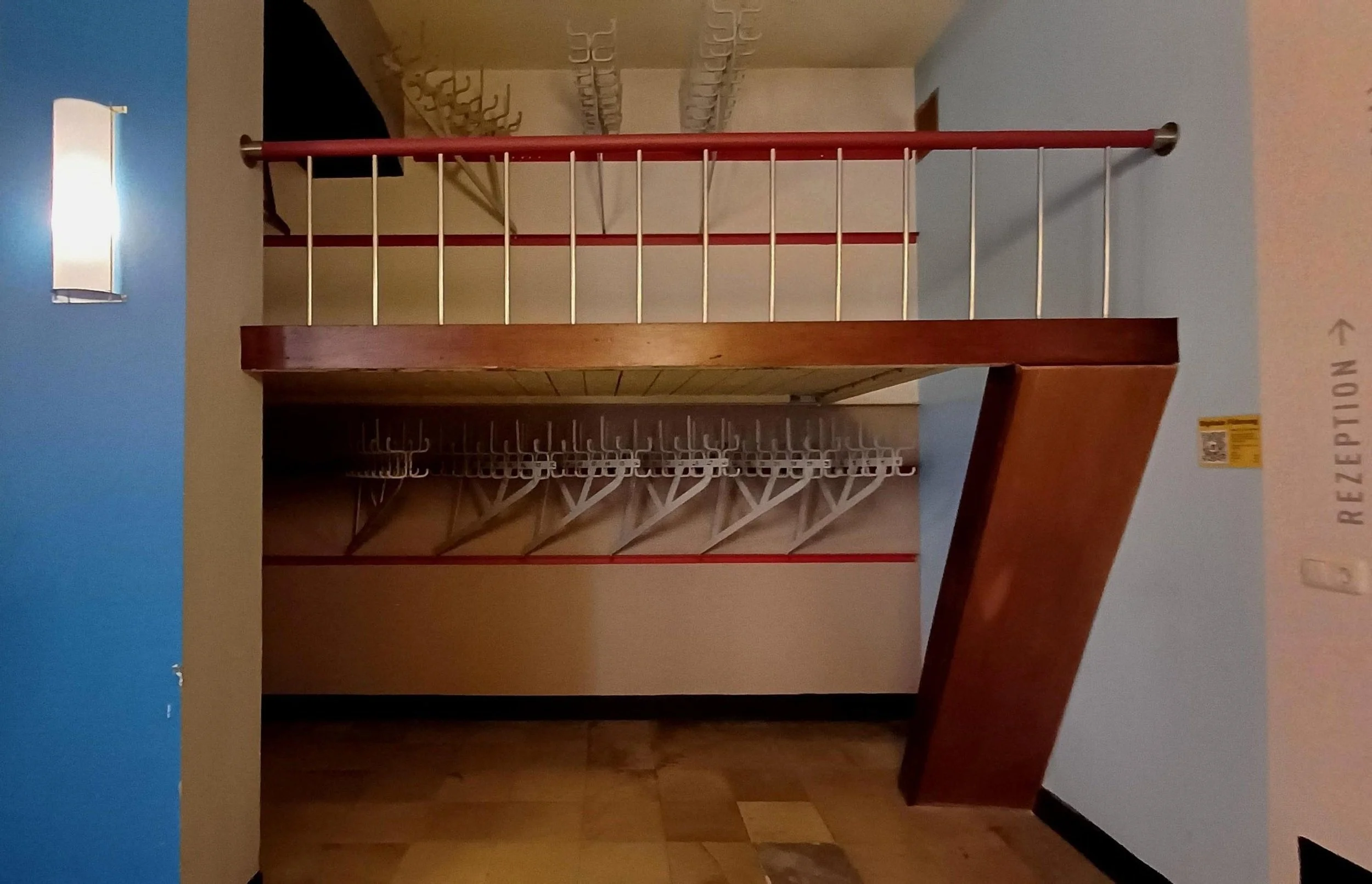Wir checken ein und beziehen die Zimmer. Letzteres ist sehr ungewöhnlich, weil wir zu den Zimmern die Treppen hinabsteigen müssen. Irgendwie ist unser Kopf doch so trainiert, dass man die Gästezimmer immer in den oberen Stockwerken verortet. Schon das Treppenhaus lässt uns staunen. Alles ist klar strukturiert und die Farbentwürfe stammen alle vom jungen Alfred Arndt.