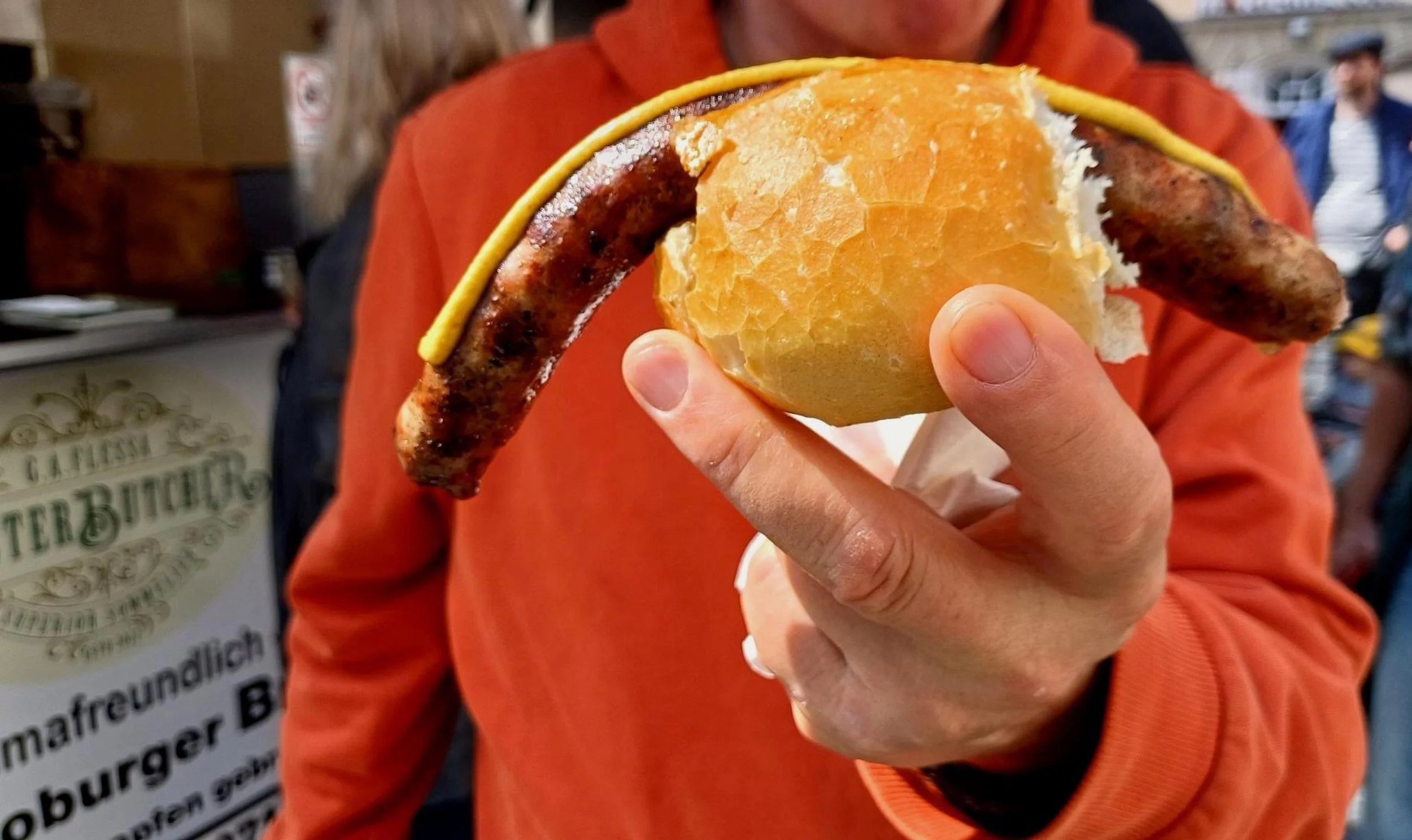 Die Gastronomen hier freuen sich über vollbesetzte Plätze in Sonnenlage. Samstags ist Markt-Tag. Die Stände locken mit regionaler Frischware und lokalen Gaumenfreuden. Wie lang ist wohl so eine original Coburger Bratwurst? Im Rohzustand soll sie genau 31 Zentimeter messen und gebraten auf einem Kiefernzapfenfeuer immerhin noch ca. 25 cm lang sein. Sie wird im sogenannten „Schleiß“ oder „Bändel“ abgefüllt, dem Dünndarm des Schweines, der nur grob von seiner Fettschicht befreit wird. Dieser hält die Wurst beim Grillen sehr saftig. Zünftig serviert wird sie übrigens im sogenannten „Weckla“.