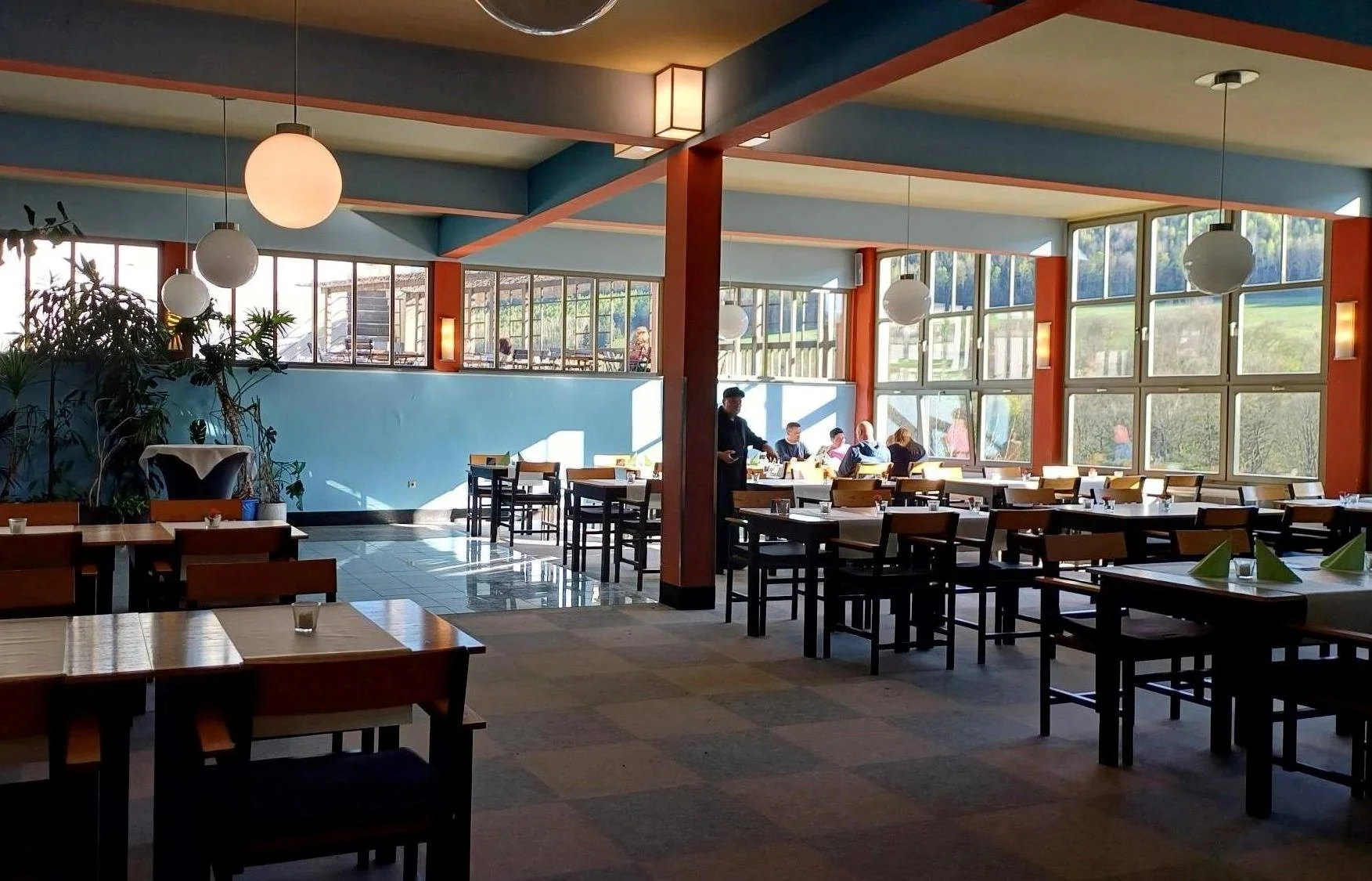 Wir werden freundlich begrüßt. Auf der Eingangs-Etage im Hochparterre - von unten gezählt die 4. Etage - befindet sich auch der „Blaue Saal“, sprich das Restaurant nebst Küche und Thekenraum. Alles zeigt sich in einer harmonischen Farbigkeit mit typischer Bauhaus-Beleuchtung.