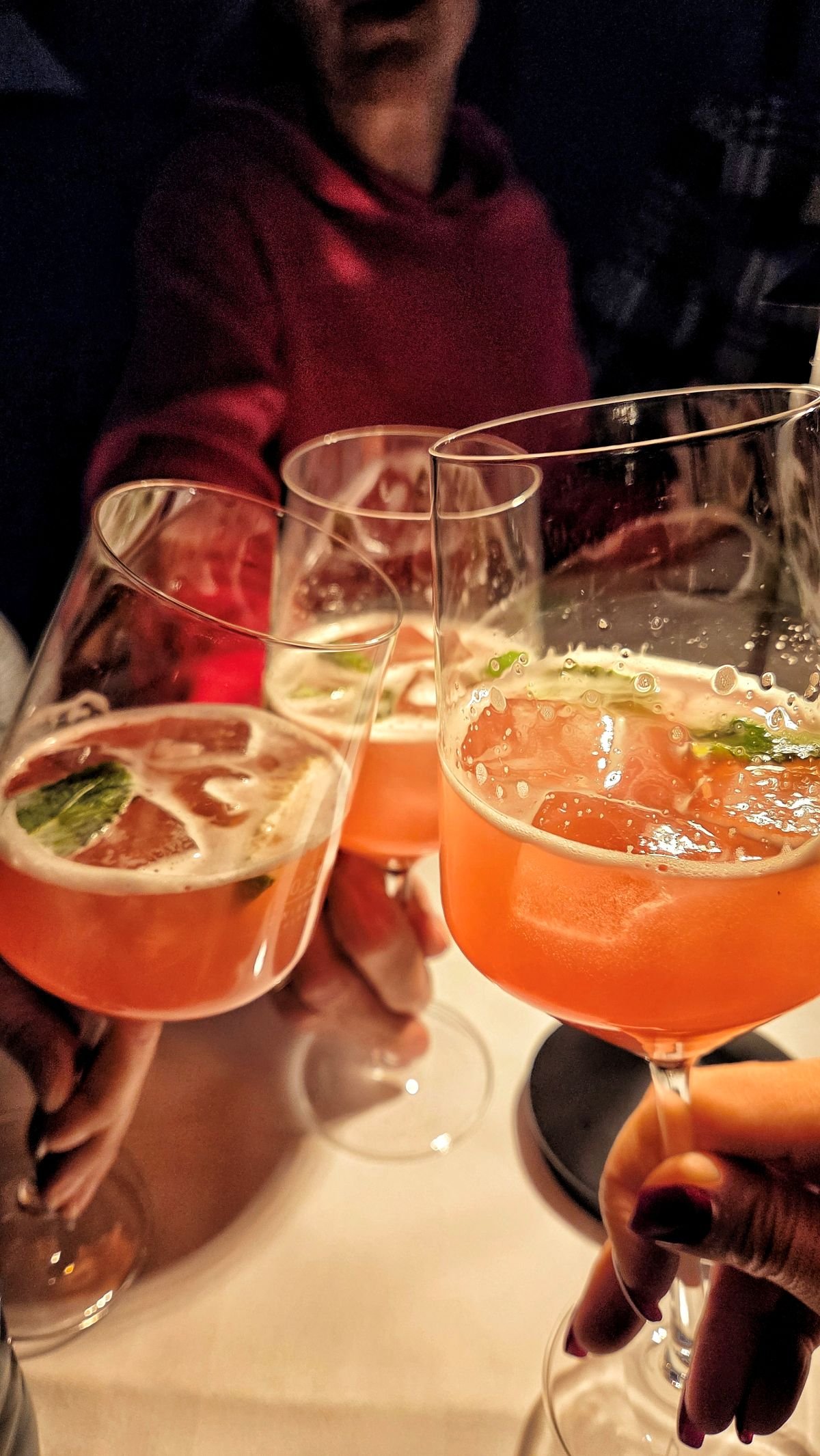 Im Glas dazu gibt es einen Grauburgunder – und wir wissen ja, der geht immer. Der hier punktet aber noch besonders durch eine mineralisch-fruchtige Note. Drei Damen am Tisch verzichten auf Alkohol und starten gesund ins Jahr. Das Konsulat ist vorbereitet: alkoholfreie Weine und Cocktails stehen bereit – und alle drei sind zufrieden mit ihrer Wahl.