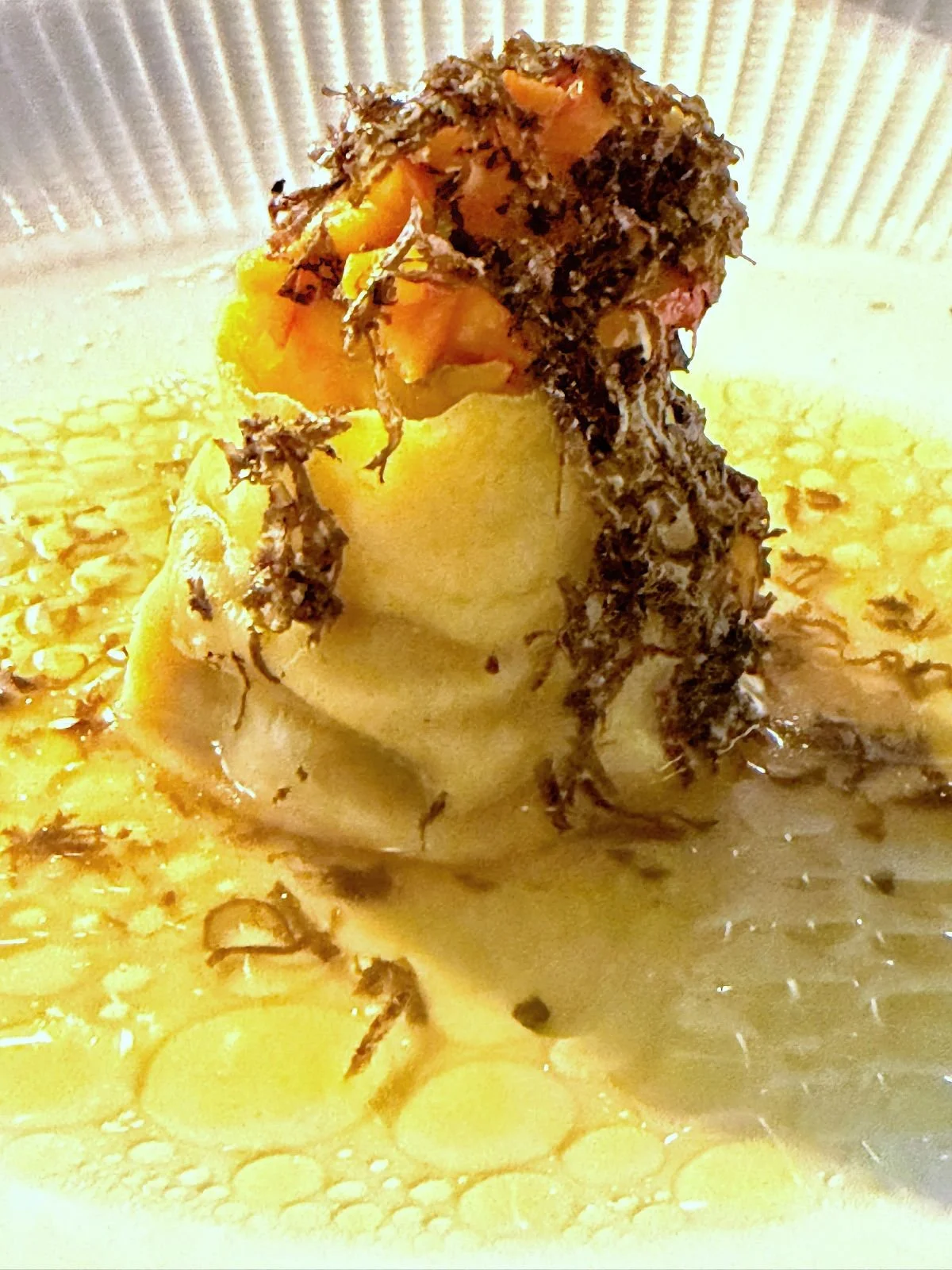 Natürlich kennen wir alle Ravioli – früher in der schrecklichen Dosenvariante, später in fein beim Italiener. Wenn es nur ein einziges Stück gibt, heißt es natürlich Raviolo. Und genau dieses Einzelstück kommt hier als dritter Gang: gefüllt mit Kürbis und Fleisch vom Ochsenschwanz, angegossen mit Brühe und mit reichlich schwarzem Trüffel bestreut.