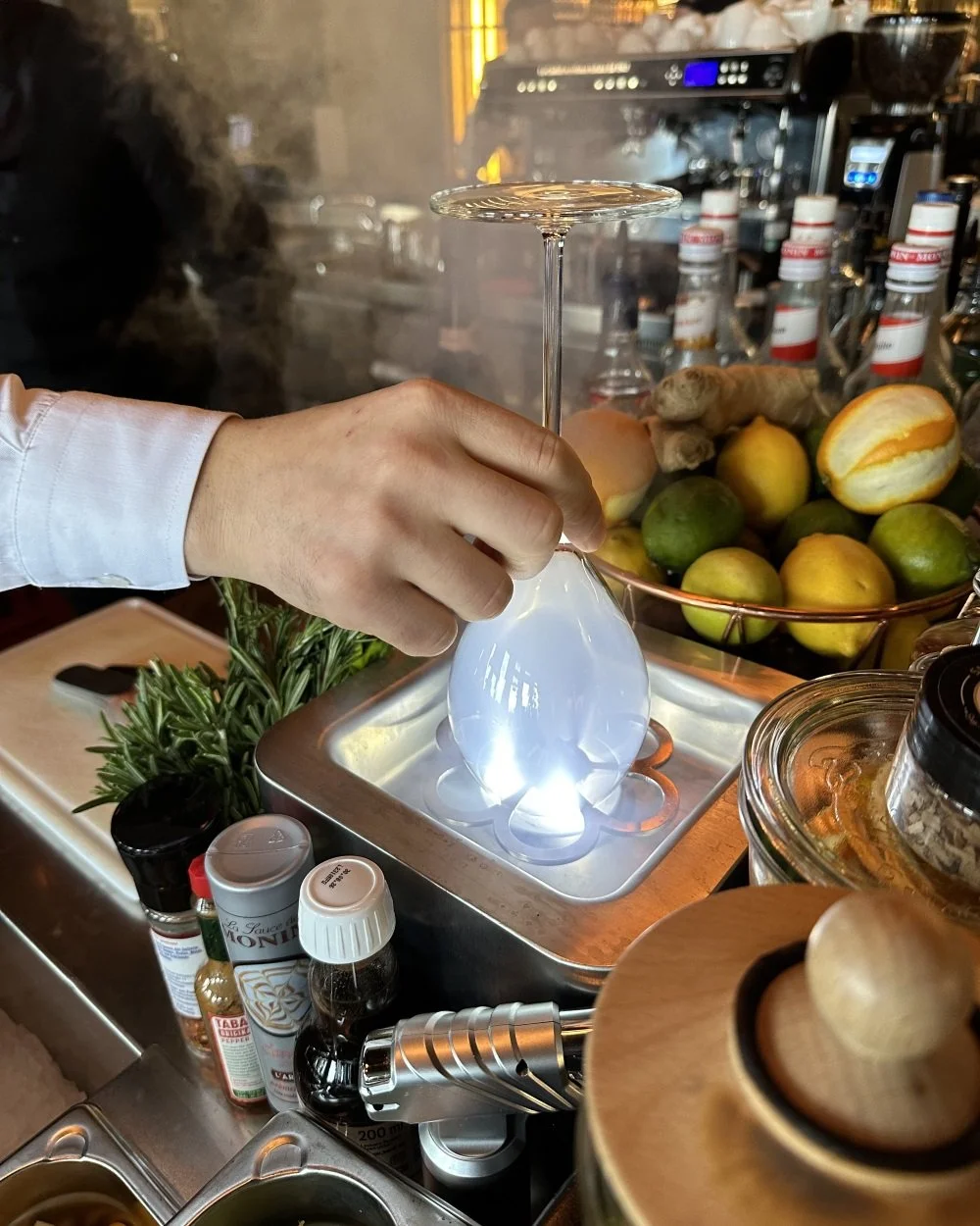 Wir wissen, was wir wollen, wir haben das schon öfter gemacht. Es soll eine Flasche Champagne Veuve Clicquot Rose für schlappe 110 Euro sein. Das ist gerade einmal rund das Doppelte des Ladenpreises, also durchaus angemessen, und bedeutet für uns Fünf jeweils 22 Euro für ein Glas Champagner. Bevor der Ober das prickelnde Zeug einschenkt, werden die Pokale eingeeist.