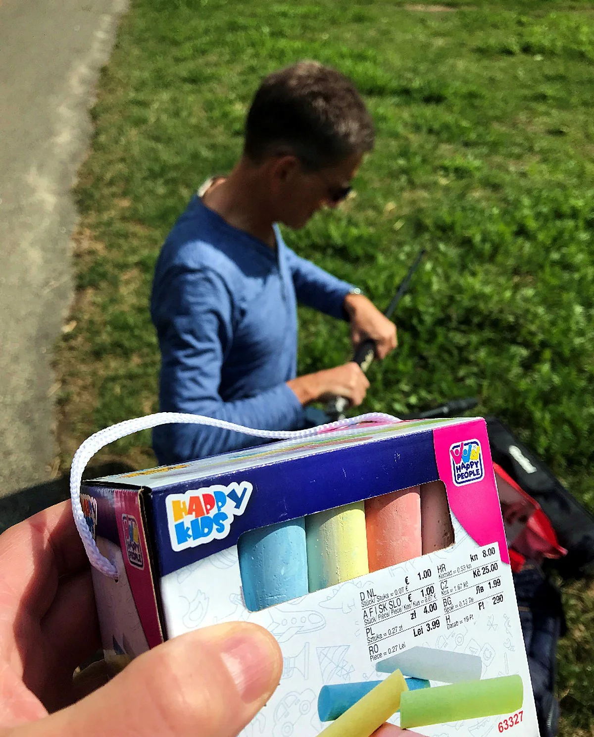 Wer Dreck macht, muss ihn auch wieder beseitigen, sonst gibt’s Ärger. Obwohl… bei der Malkreide wären die Tatbestände der Sachbeschädigung oder Vermüllung sicherlich nicht erfüllt. Egal. Wasser und Schrubber marsch!