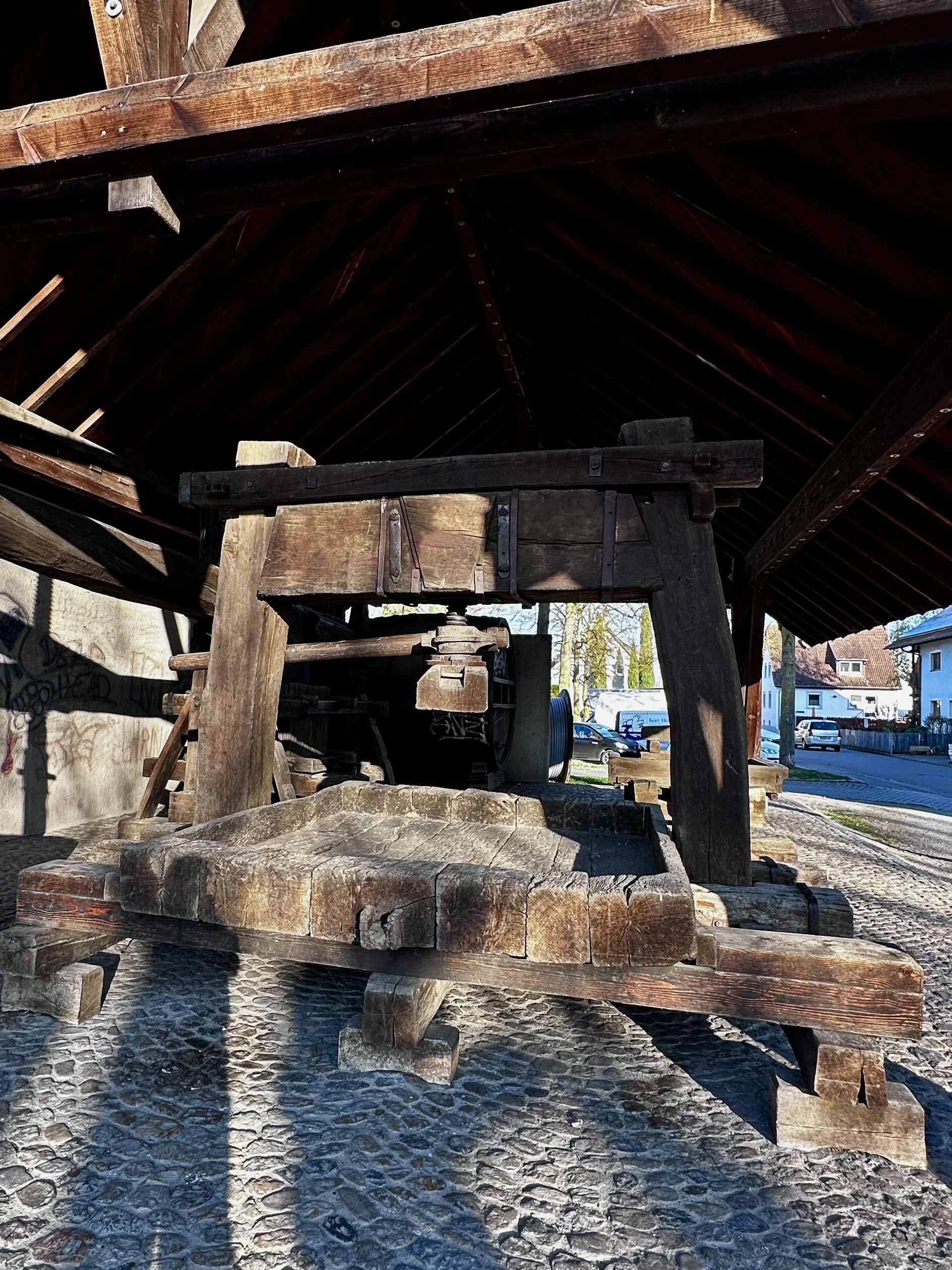 Ich versuche, Merdingen kreisförmig zu erschließen. Zuerst von der Langgasse nach rechts in den Löschgraben, vorbei an der Jan-Ullrich-Straße. Bekanntermaßen ein deutscher Radrennfahrer, der nach seinem Erfolg bei der Tour de France 1997 nach Merdingen zog. Links auf er anderen Seite der Straße steht eine mächtige Holzkonstruktion. Was das wohl mal war? Keine Ahnung. Irgendetwas mit Weinbau vielleicht? Ich frage meine Schwägerin und die weiß Bescheid: Es ist ein Denkmal für die ehemaligen Keltermethoden des heimischen Weinbaus. Das ist eine Baumtrotte mit Pressbaum und Spindel, also eine alte Weinpresse mit allem Drum und Dran. Was es nicht alles gibt. Und wieder etwas schlauer geworden.