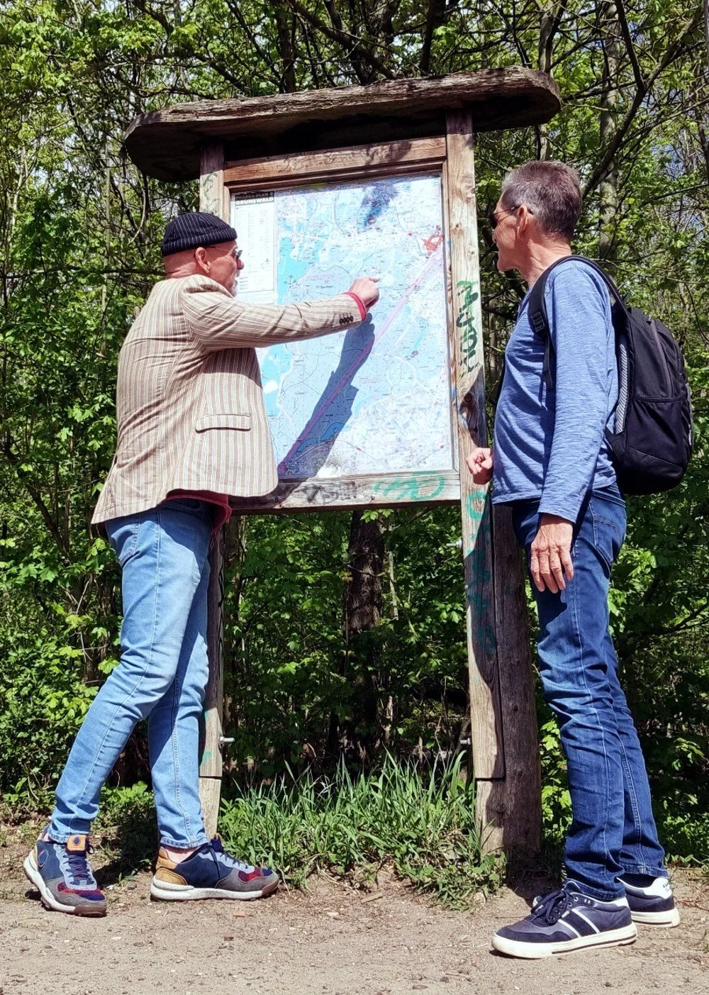 Wozu der Schrubber? Wir sind keine Graffiti-Sprayer und wollen keine Spuren hinterlassen. Wir werden alles wieder fein sauberputzen, nicht wahr! Gerade als wir losmarschieren wollen, nähern sich von oben zwei Fahrzeuge der Berliner Forsten. Die dürfen hier natürlich fahren. Aber, ob die mit unserer Aktion einverstanden sind? Keine Ahnung! Schnell noch einmal alles in den Kofferraum zurückgelegt und so getan, als seien wir nur zwei Touris, die ein Selfi machen wollen.