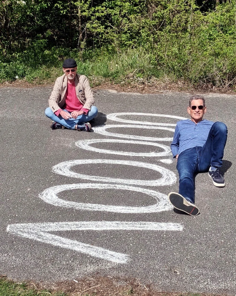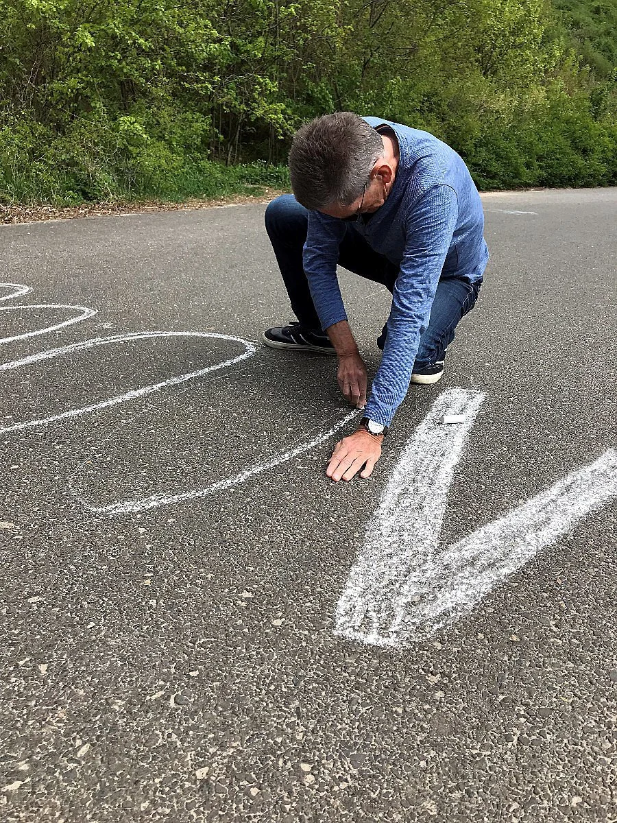 Mitten drin beim Putzen kommt das ältere Ehepaar vom Anfang unserer Aktion wieder die Straße hinunter. Sie bleiben stehen. „Das hätten sie doch stehen lassen können. Vielleicht wäre der Hinweis ‚Ab hier bis zum Gipfel 100.000 Schritte‘ ganz schön gewesen, oder?“, spricht uns den Mann leutselig an. Wir sind ganz begeistert von dem Volk hier auf der Straße zum Drachenberg. Wir diskutieren noch einige Minuten mit dem Ehepaar über das Internet im Allgemeinen und im Besonderen, über den Handywahnsinn und die Abhängigkeit der Jugend von den sozialen Medien. Schließlich gehen sie weiter und wir packen zusammen. Das war ein erfolgreiches Fotoshooting. Wir sind zufrieden!