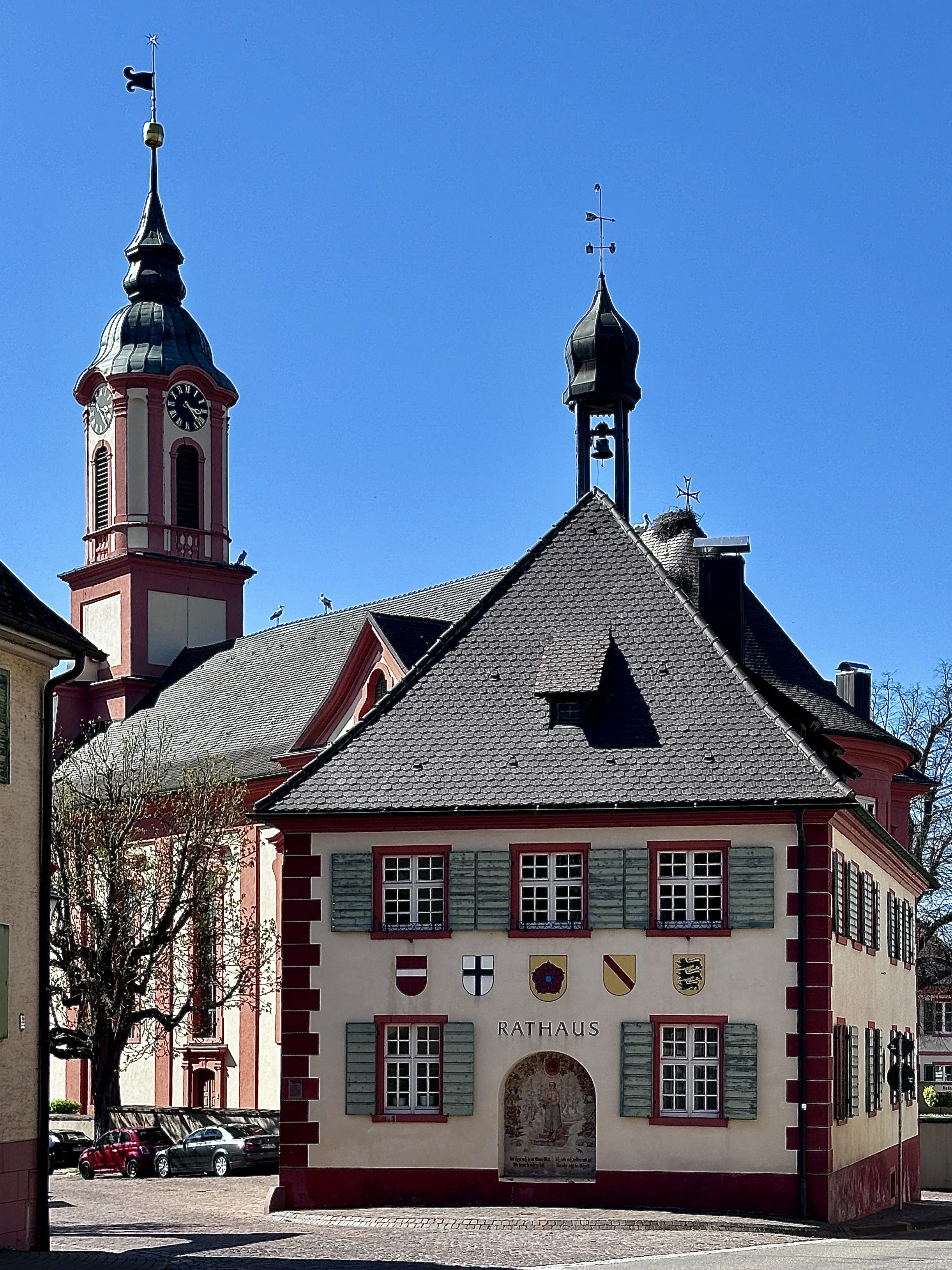 Wenn man die Straße vom Tuniberg herunterkommt und das Ortsschild passiert hat, sollte man das Tempo stark drosseln, sonst ist man durch, bevor man überhaupt etwas gesehen hat. Der Ort ist klein. Rund 2.500 Einwohner teilen sich das hübsche Fleckchen Erde. Wir fahren ein. Entlang der Langgasse trudeln die Räder aus. Ehefrau und Mutter lassen mich aussteigen, sie fahren zur Unterkunft. Ich bleibe. Der erste Blick geht zum Rathaus.