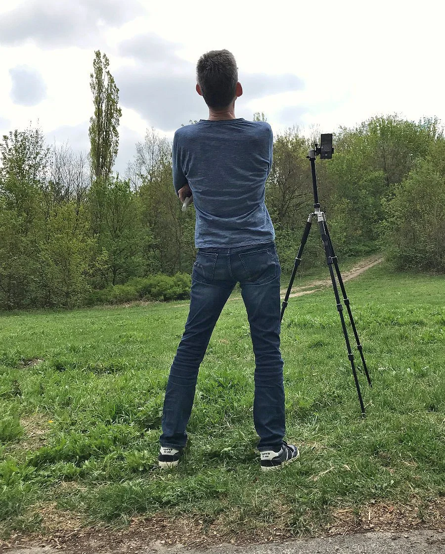 Die Bilder mit der 100.000 sind im Kasten. Jetzt wollen wir noch einen Shot mit Laptop und Fotoapparat machen. Das Handy wird etwas tiefer auf dem Stativ platziert und der Timer eingestellt. „Lächeln!“, ruft Thomas zum wiederholten Mal und der Countdown startet.