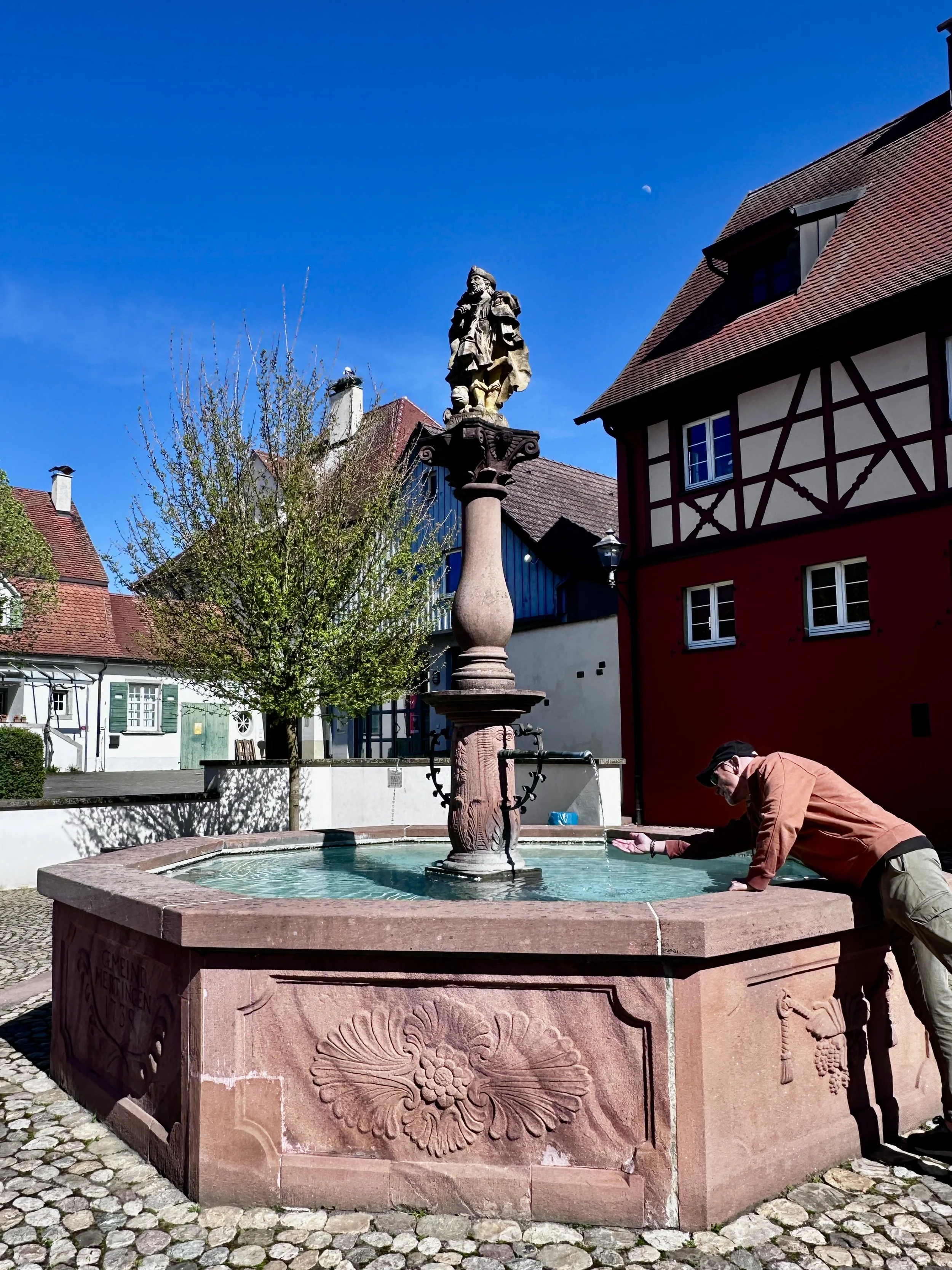 Direkt dahinter erkenne ich den Kirchturm der Pfarrkirche St. Remigius, der von fast überall im Ort zu sehen ist. Eindrucksvoll reckt er seinen langen Hals in die Höhe und ruft die Gläubigen zum Gebet. Die alte Kirche, die dort mal stand, wurde erstmals 1139 erwähnt und gehörte damals dem Hochstift Basel. Schräg gegenüber in der Stockbrunnengasse schaue ich mir den gleichnamigen Brunnen an, der seinen Namen durch den mit Masken von Quellgeistern und zwei wasserspeienden Röhren gezierten Brunnenstock erhielt. Anfänglich trug der Brunnenstock auf seiner Spitze vermutlich eine aufgesetzte Kugel, die 1756 jedoch der kleinen Wendelinusstatue des Bildhauers Johann Baptist Sellinger weichen musste. Und wer sich jetzt nicht ganz in kirchlicher Geschichte auskennt, dem sei gesagt, dass Wendelin ein katholischer Heiliger war. Ich lasse mir etwas kaltes Wasser durch die Hände laufen. Erfrischend, denn die Luft ist erstaunlich warm.