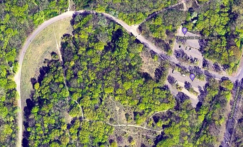 Für unser 100.000 Klicks-Opener-Bild brauchen wir eine geeignete Location. Unsere Idee ist, die 100.000 mit Kreide auf den Asphalt zu malen und uns dann damit zu fotografieren. Sollten allerdings ständig PS-Boliden uns und unser Werk stören wollen, würden wir Tage zur Umsetzung brauchen. Folglich brauchen wir eine ruhige Asphaltstraße ohne Autos. Doch wo gibt es so etwas in Berlin und Umgebung? Nach einigem Hin und Her wählen wir den Teufelsberg im Berliner Grunewald. Über die Teufelsseechausee gelangen wir zum Parkplatz am Drachenberg.