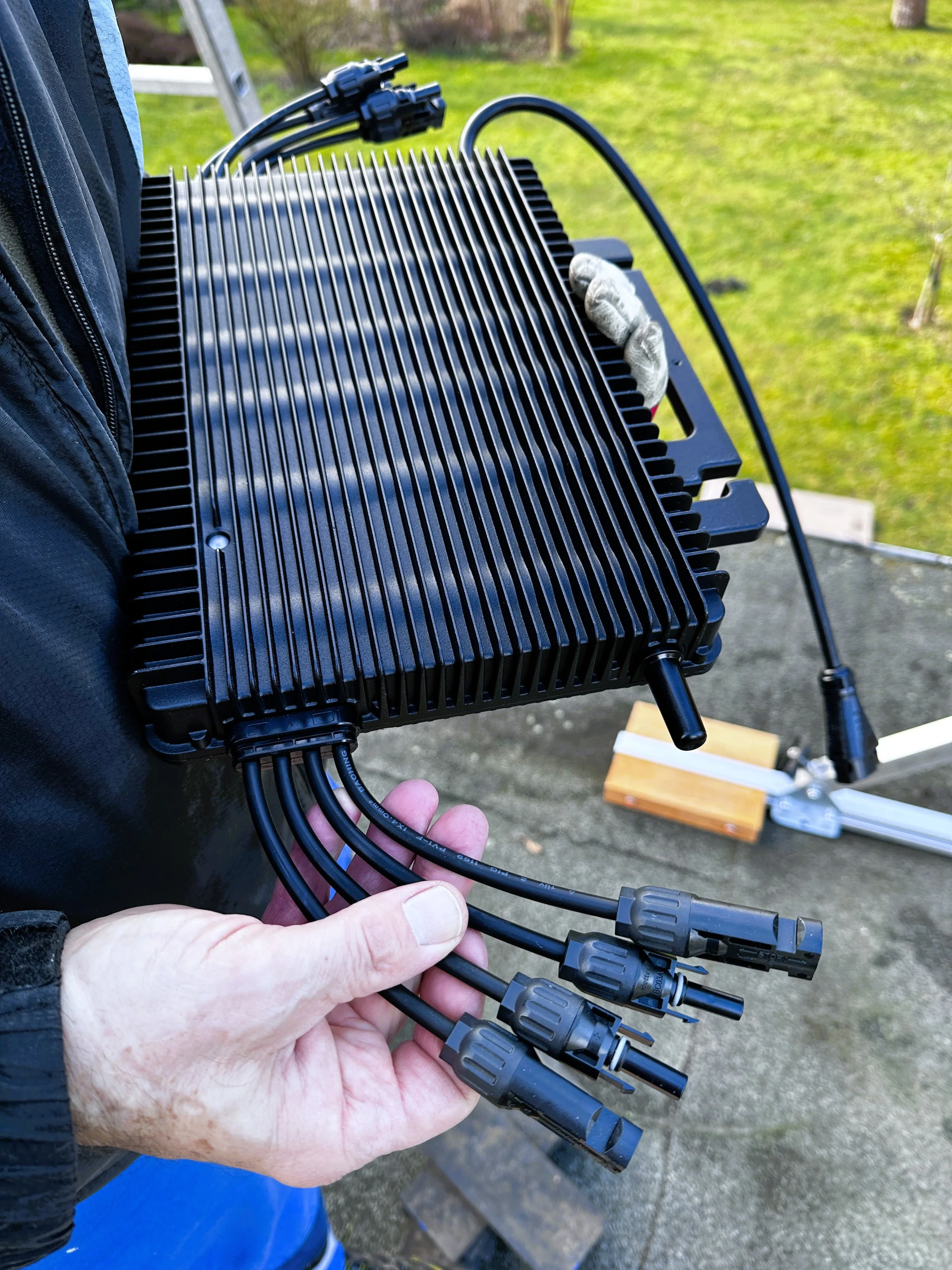 Roland schließt nun alle vier Module an den Wechselrichter an, der an einer Querstrebe unter dem äußerst linken PV-Panel hängt. Die Stecker und Buchsen sind Regenwasser geschützt und passen genau zusammen. Easy going.