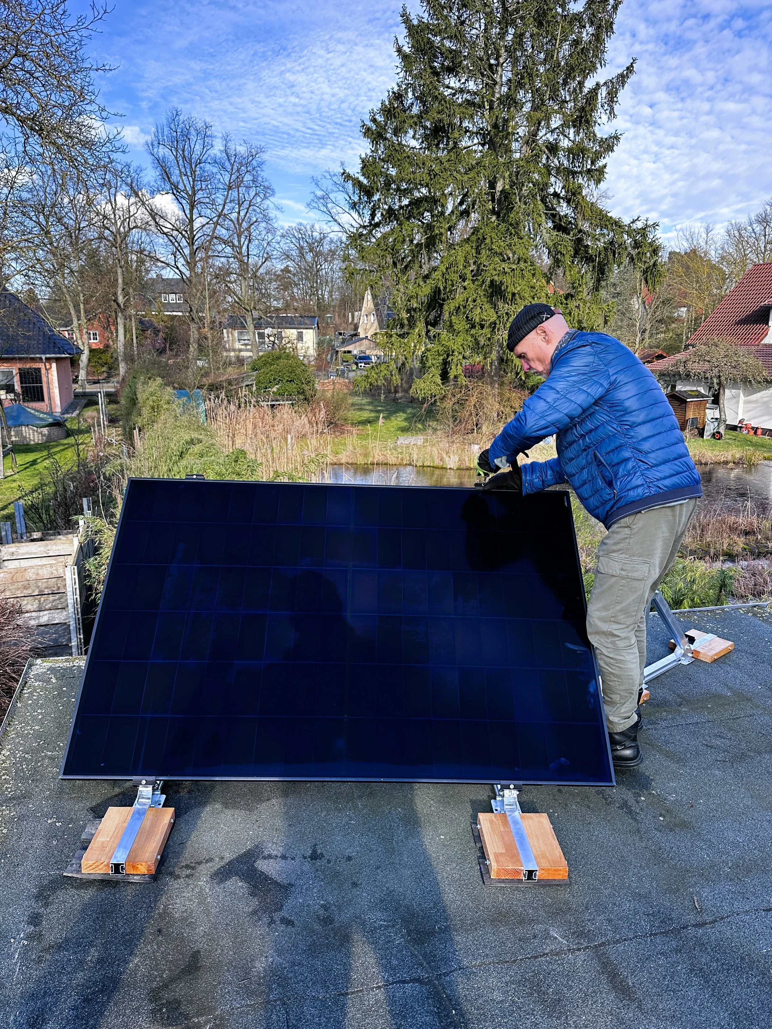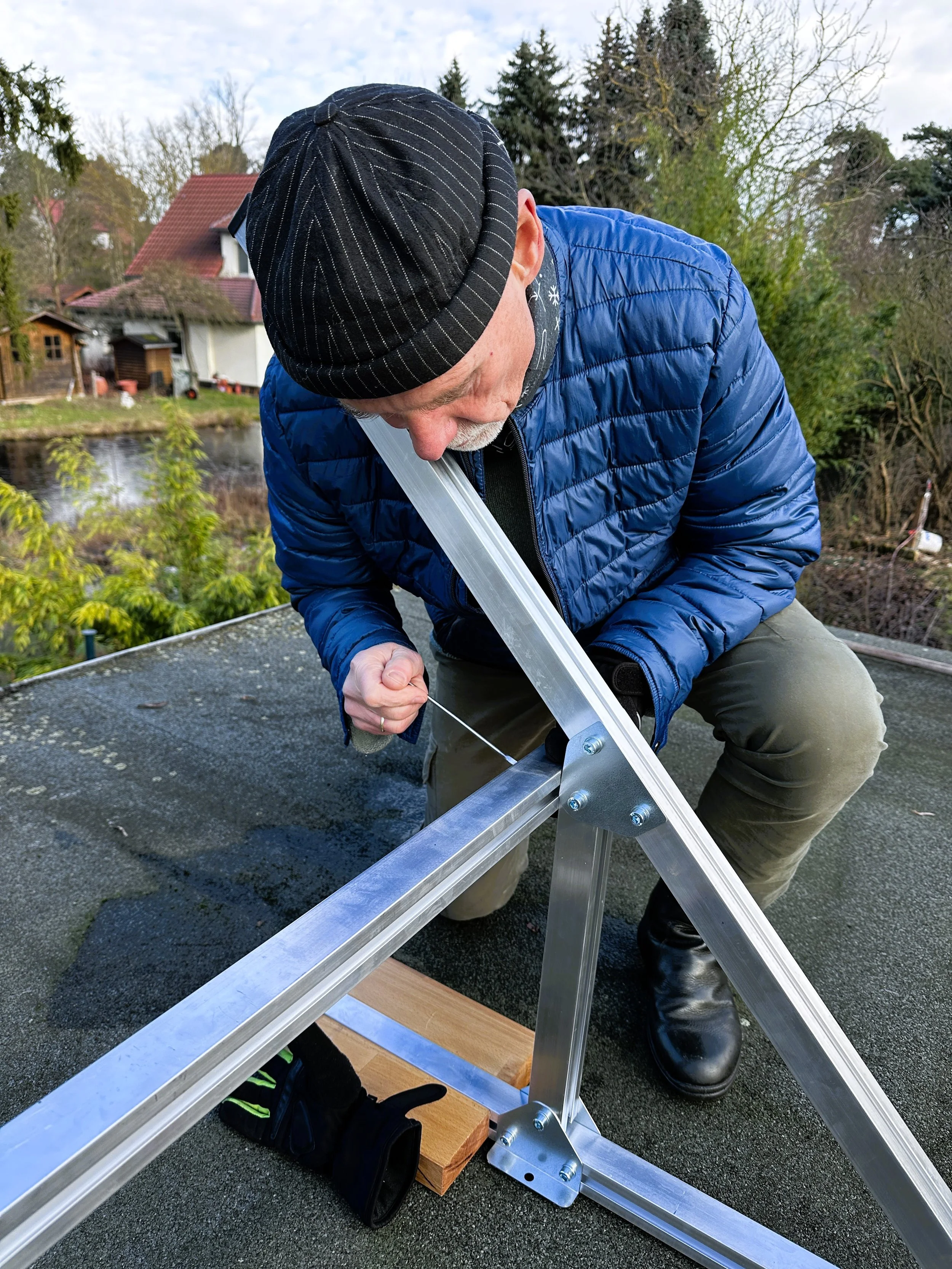 Ich bin ja nur unterstützend tätig. Aber oftmals helfen andere Gedanken weiter, den Entscheidungsprozess positiv zu beeinflussen. Schließlich sind wir uns einig und markieren die Stellen auf dem Dach. Klar ist, dass final die genauen Positionen noch verändern werden können. Der Unterbau ist jetzt dran. Die Ständer zusammenzuschrauben, ist recht einfach. Wir arbeiten beide jeweils an einer Seite. Mit Handschuhen ist es schlecht, ohne geht es besser.