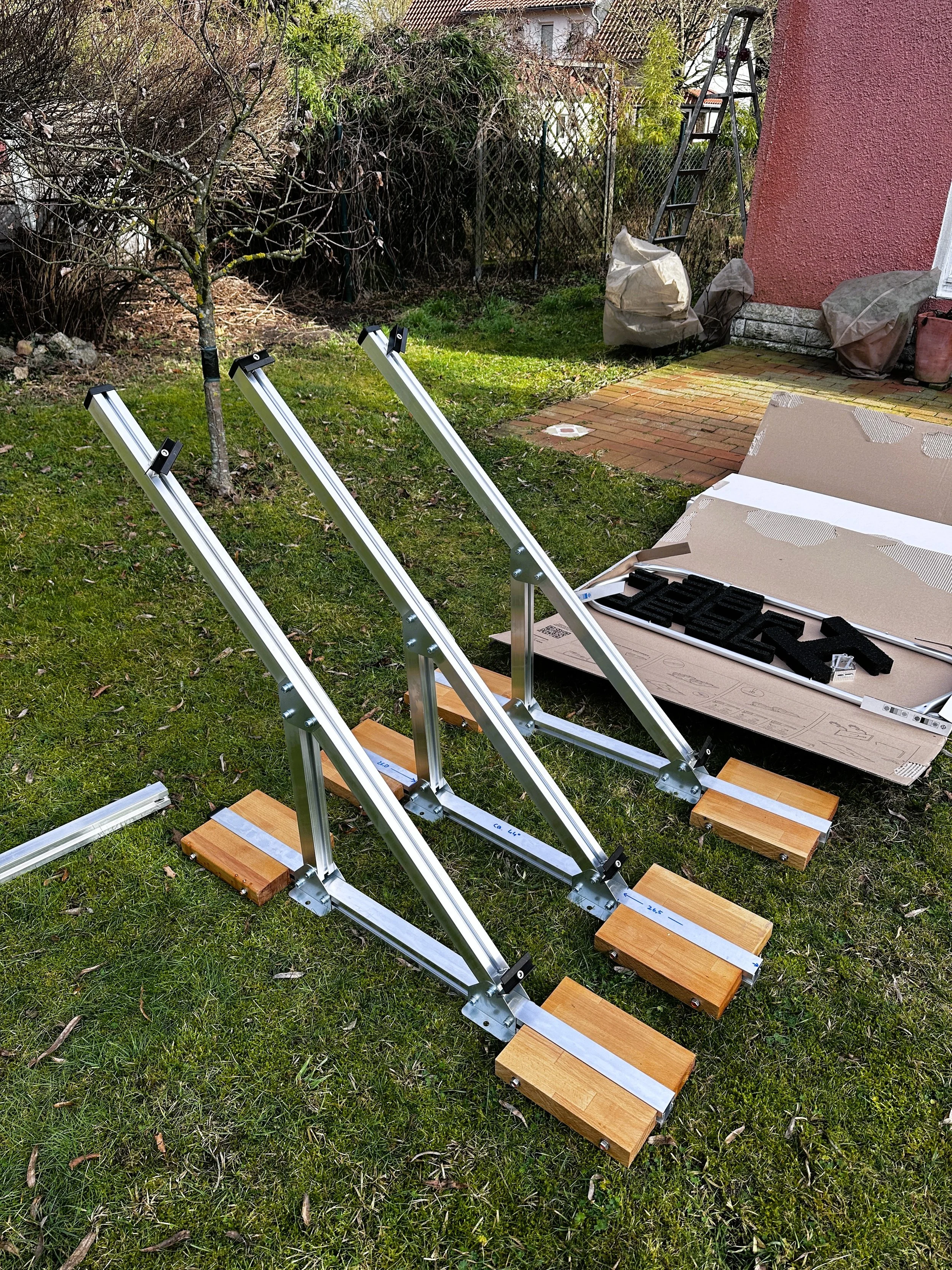 Heute Mittag helfe ich Nachbar und Freund Roland bei dem Aufbau einiger Solarpanels auf dem Dach seines Schuppens. So kann ich schon einmal die rein praktische Seite einer Photovoltaik-Installation kennenlernen. Als erstes ordnen wir, noch am Boden, die Gestelle.