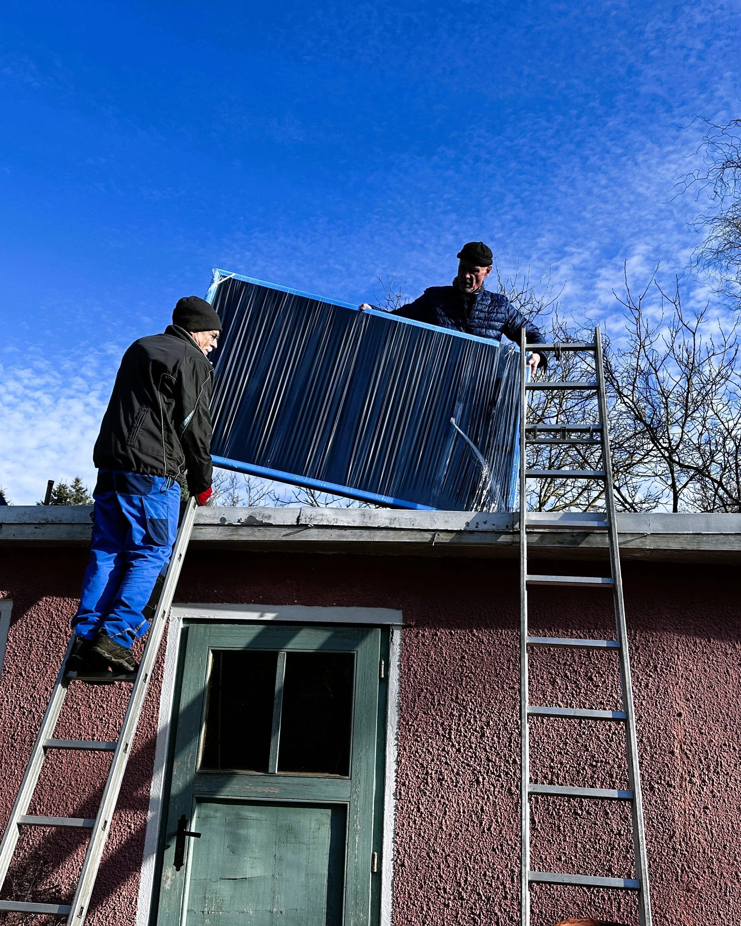Der schwerste Teil kommt jetzt: die Module auf das Dach bringen. Sie wiegen glücklicherweise nur etwas mehr als 20 Kilo, sind aber ziemlich groß. Wäre das Dach noch viel höher, hätten wir ein echtes Problem. Aber so, bei knapp drei Metern ist das Ganze keine wirkliche Schwierigkeit. Langsam, Schritt für Schritt, schieben wir sie auf den Leitern nach oben. Dann hält Roland das Modul allein und ich mache einen großen Schritt auf das Dach, um das Teil abzunehmen. Läuft!