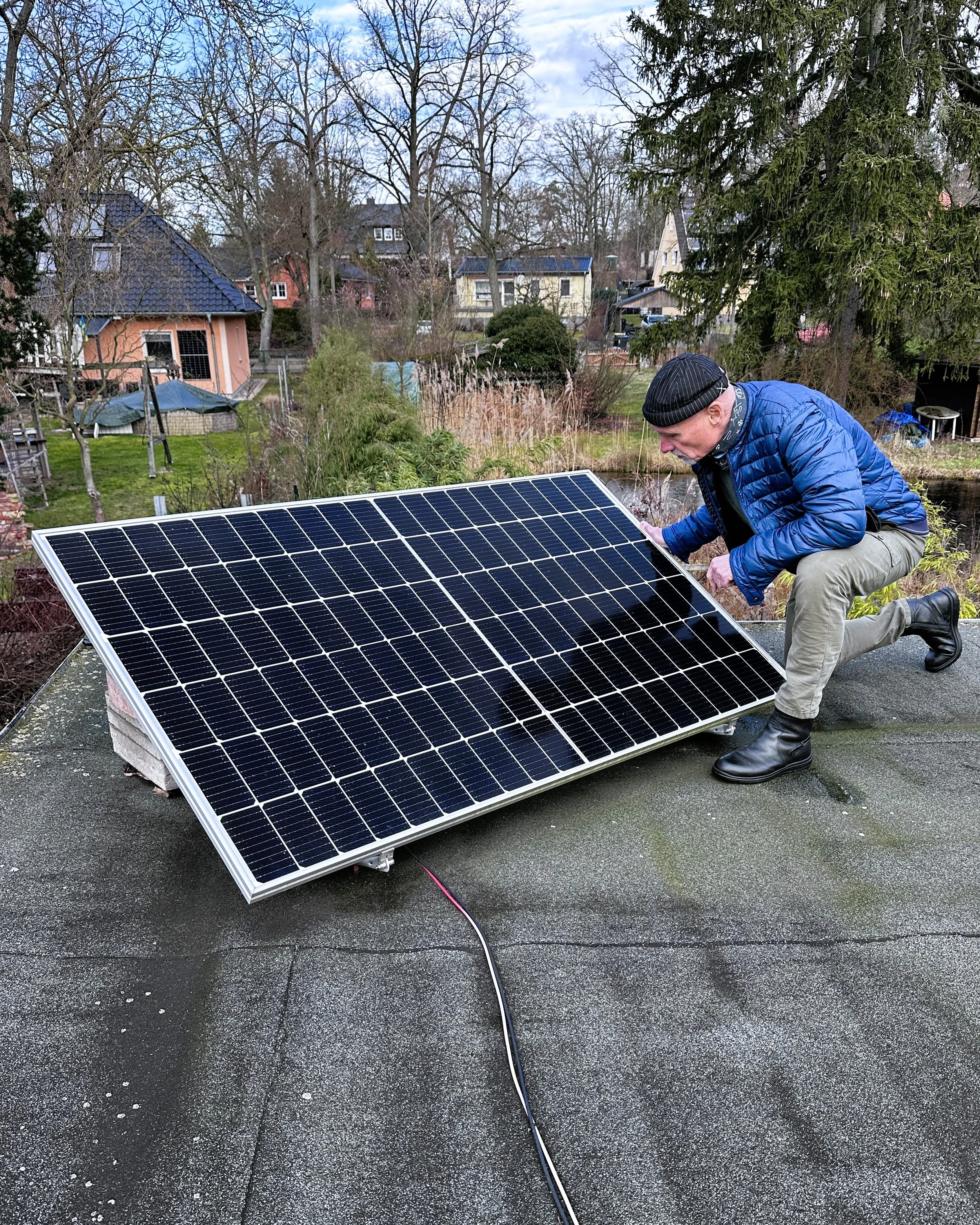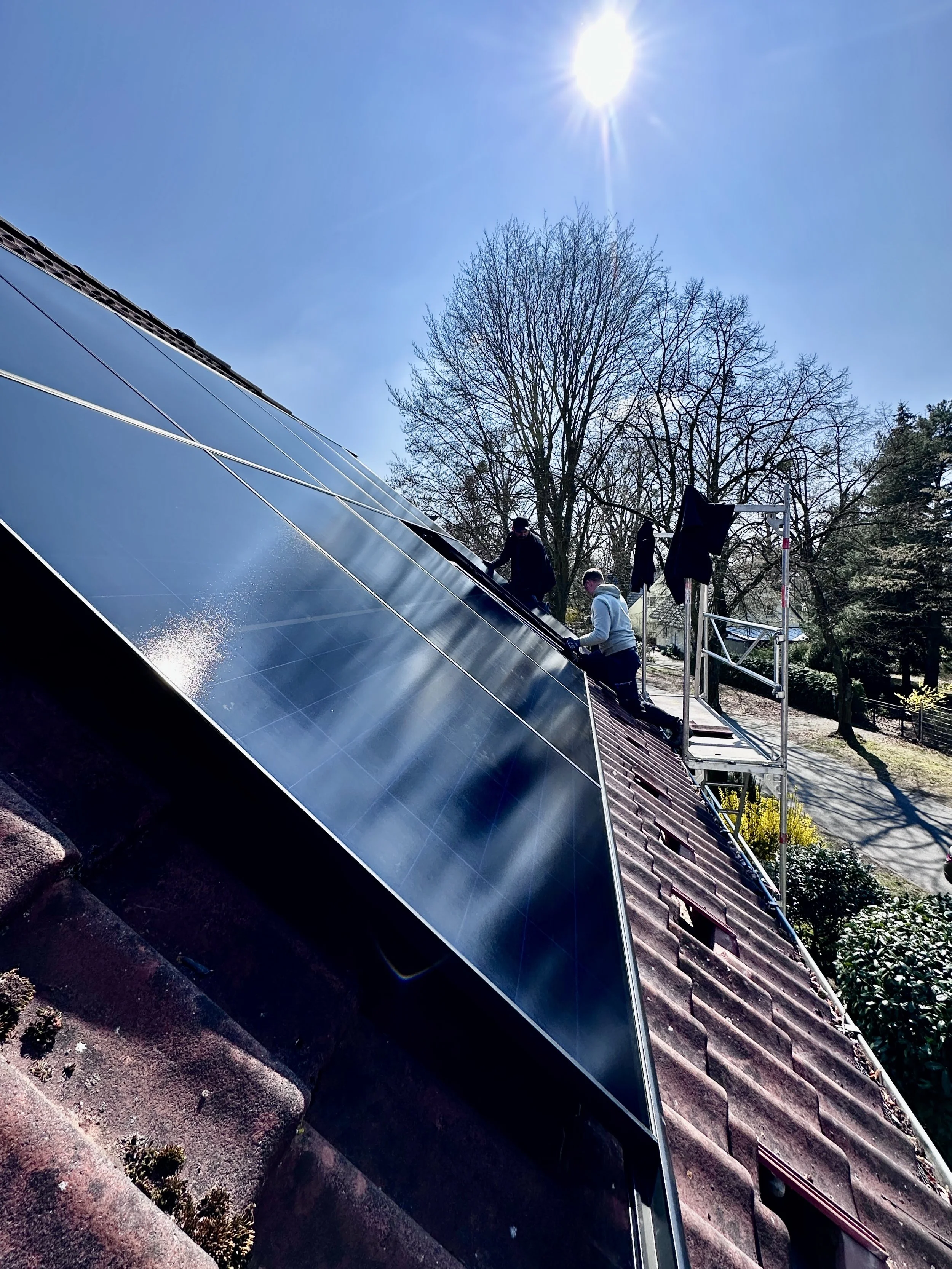 Ich schaue mir die Installation auf der Westseite durch das Dachfenster an. Ich bin im Bad auf die Badewanne gestiegen und blinzle in die Sonne. Sieht super aus und ist echt aufregend.