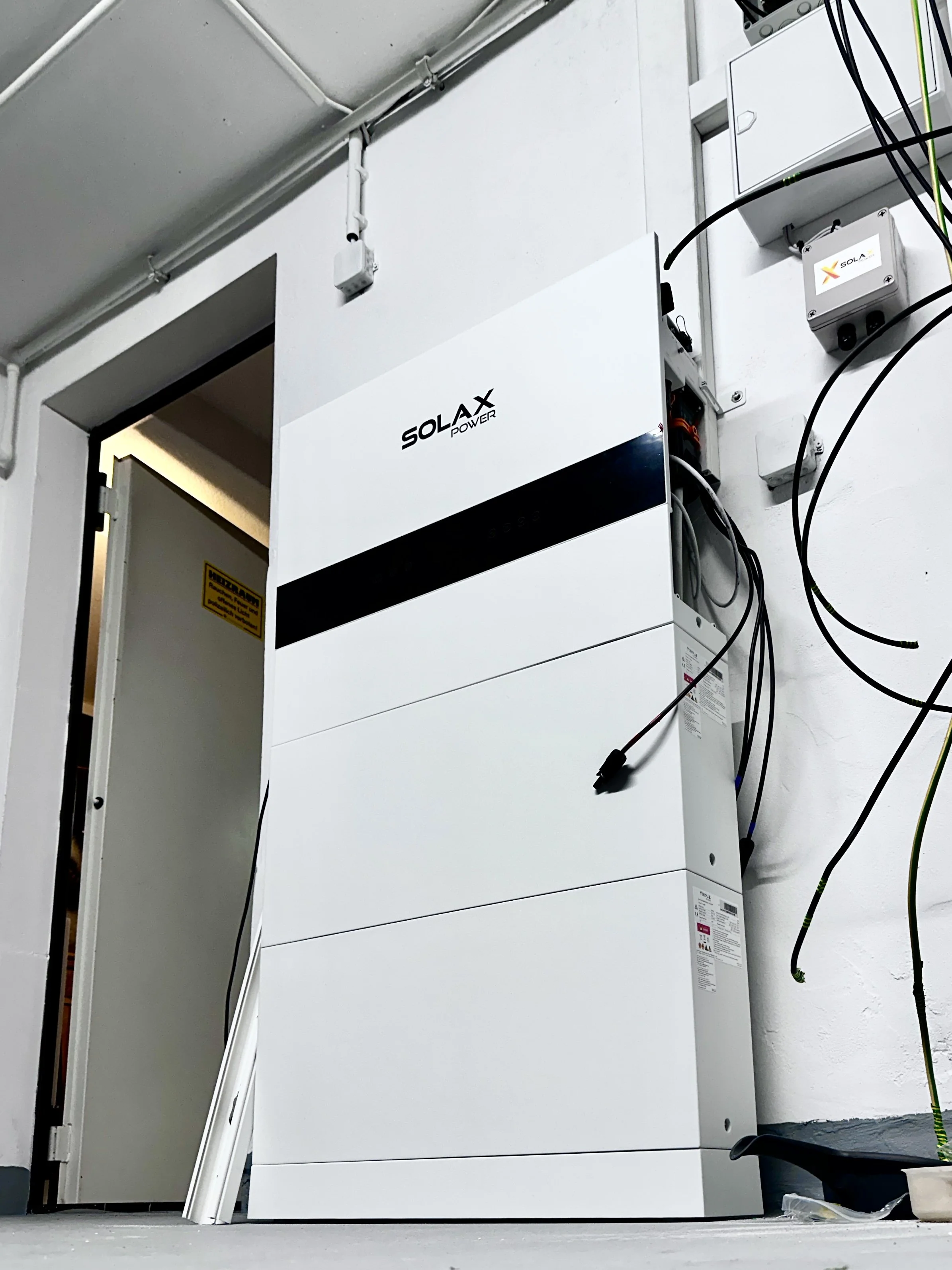 Als Erstes erscheint der Elektriker dieser Firma. Er heißt Pavel, kommt ursprünglich aus Polen, lebt aber schon länger in Brandenburg und spricht gut Deutsch. Nach kurzem Smalltalk zeige ich ihm, wo die Batterien platziert werden sollen und er legt los. Am zweiten Tag ist sein Job zunächst erledigt. Es geht weiter, wenn die Paneele auf dem Dach sind. Sieht schon einmal gut aus.