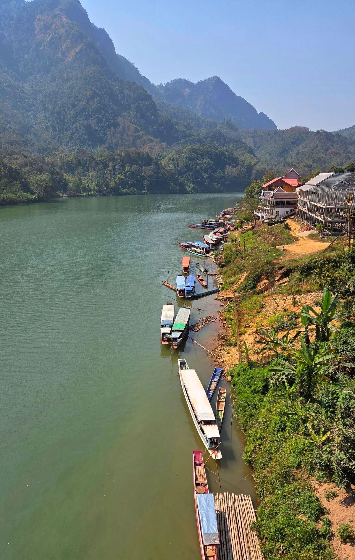 Doch auch der längste Höllenritt endet irgendwann und wir stehen zwischen dunkelgrünen Karstfelsen am Ufer des Nam Ou. Malerisch liegen Longtailboote im Wasser und warten auf Touris für eine Ausflugsfahrt.