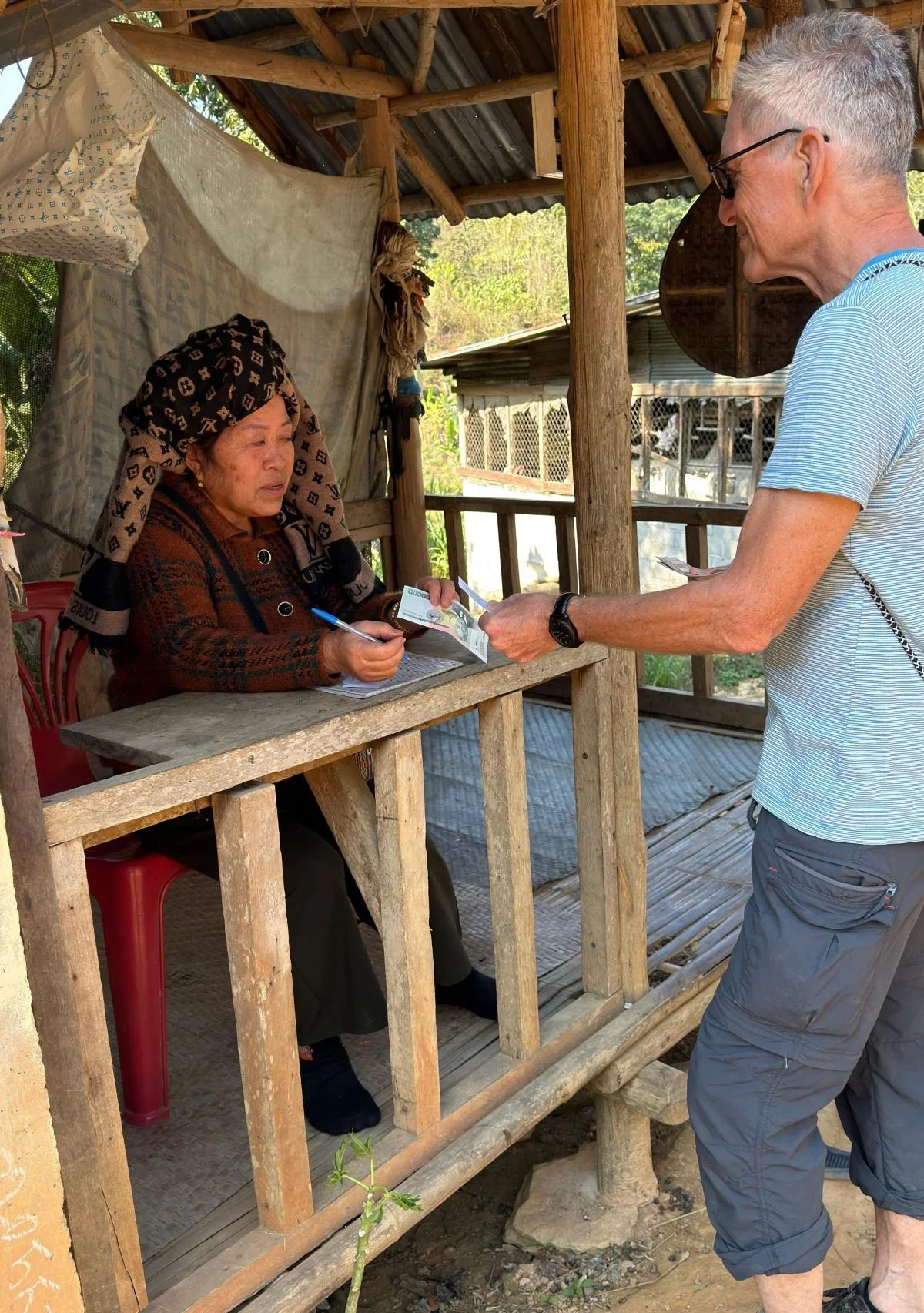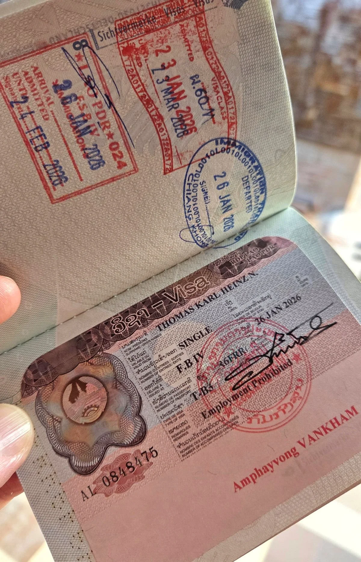 Am Grenzposten in Laos heißt es Antrag auf „visa on arrival“ ausfüllen, Passbild abgeben und 40 druckfrische US-Dollar bezahlen. Mein mitgebrachter 20-Dollar-Schein mit einer angeranzten Ecke schafft es nicht durch die strenge Prüfung des Grenzbeamten. Zum Glück können wir die fehlenden Noten zusammenkratzen und letztendlich klebt das Laos-Visum in meinem Pass, auch wenn meine vielen Vornamen für Verwirrung sorgen.