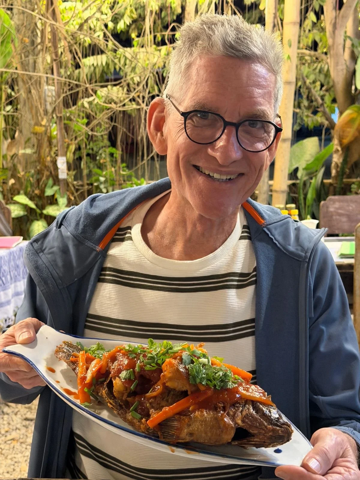 Zum Abendessen locken unzählige Restaurants an der „Haupt“-Straße mit riesigen Foto-Angebotstafeln. Fried Rice with Tofu, Chicken, Pork ist allgegenwärtig. 2,50 Euro ist der Standardpreis. Ich leiste mir allerdings etwas Besonderes für 6 Euro: Fried Fish mit Tomatensoße.