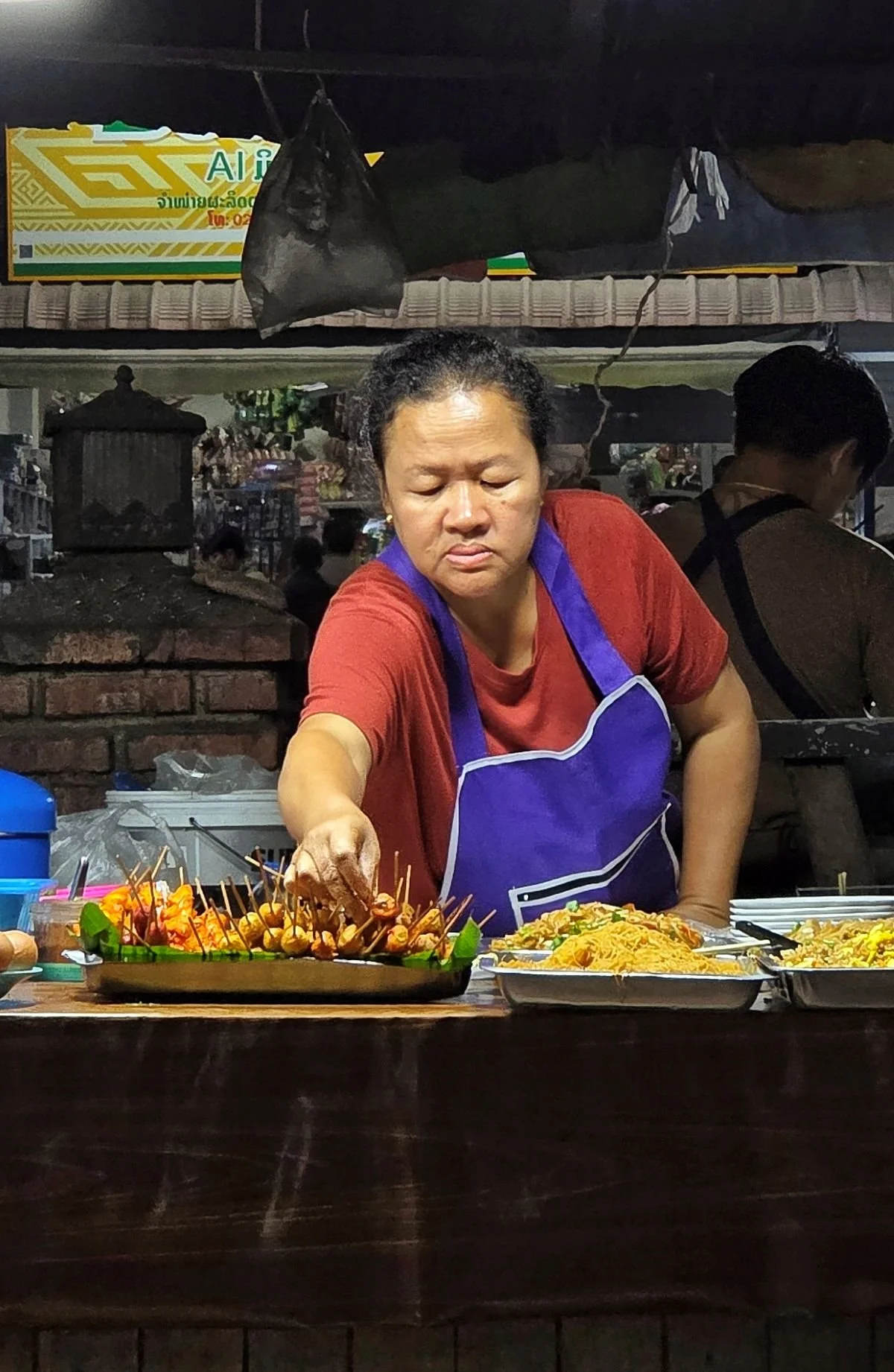 Nun lockt der Nachtmarkt. Rauch steigt aus den Pfannen, der Duft von Knoblauch, Chili und frischem Gemüse liegt in der Luft. Die Stände bieten fast identische Gerichte: gebratener Reis, Nudeln, Spieße. Wie sollen wir uns entscheiden, wo gibt’s das beste?