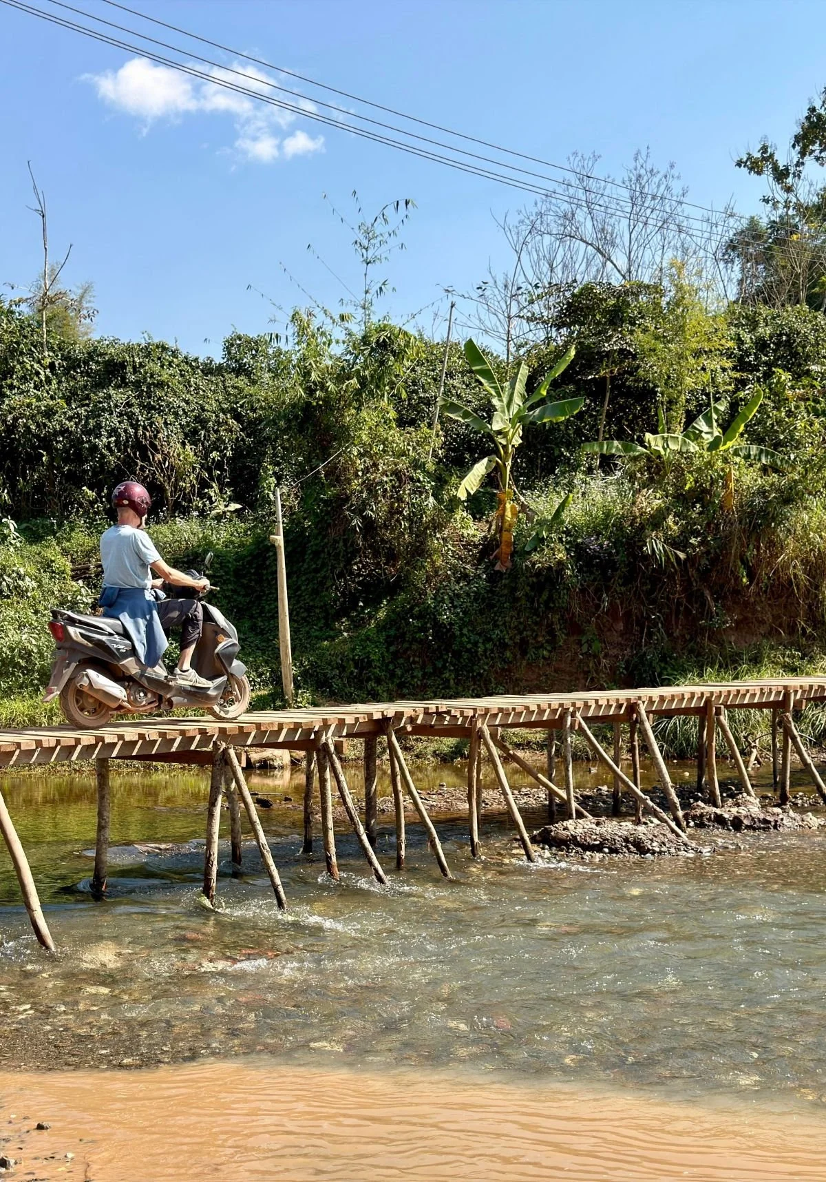 Der Lack ist verkratzt, die Sitzbank ausgeblichen, die Tankanzeige defekt und der Blinker mit Tesa-Film fixiert. Doch gerade das beruhigt, ein neuer Kratzer würde hier kaum auffallen. Und es hat seinen Vorteil auf den Schotter-Buckel-Sandwegen mit Sturzgefahr. Dort heißt es konzentriert-vorsichtig, doch nicht ängstlich-langsam zu fahren. Vor uns liegt eine Brücke aus groben Bohlen, zwischen den Brettern klaffen faustgroße Lücken. Das Holz knarrt, der Roller holpert, mein Herz schlägt schneller. Mit einem mutigen Ruck steuere ich hinüber und atme erleichtert auf, als ich das andere Ufer erreiche.