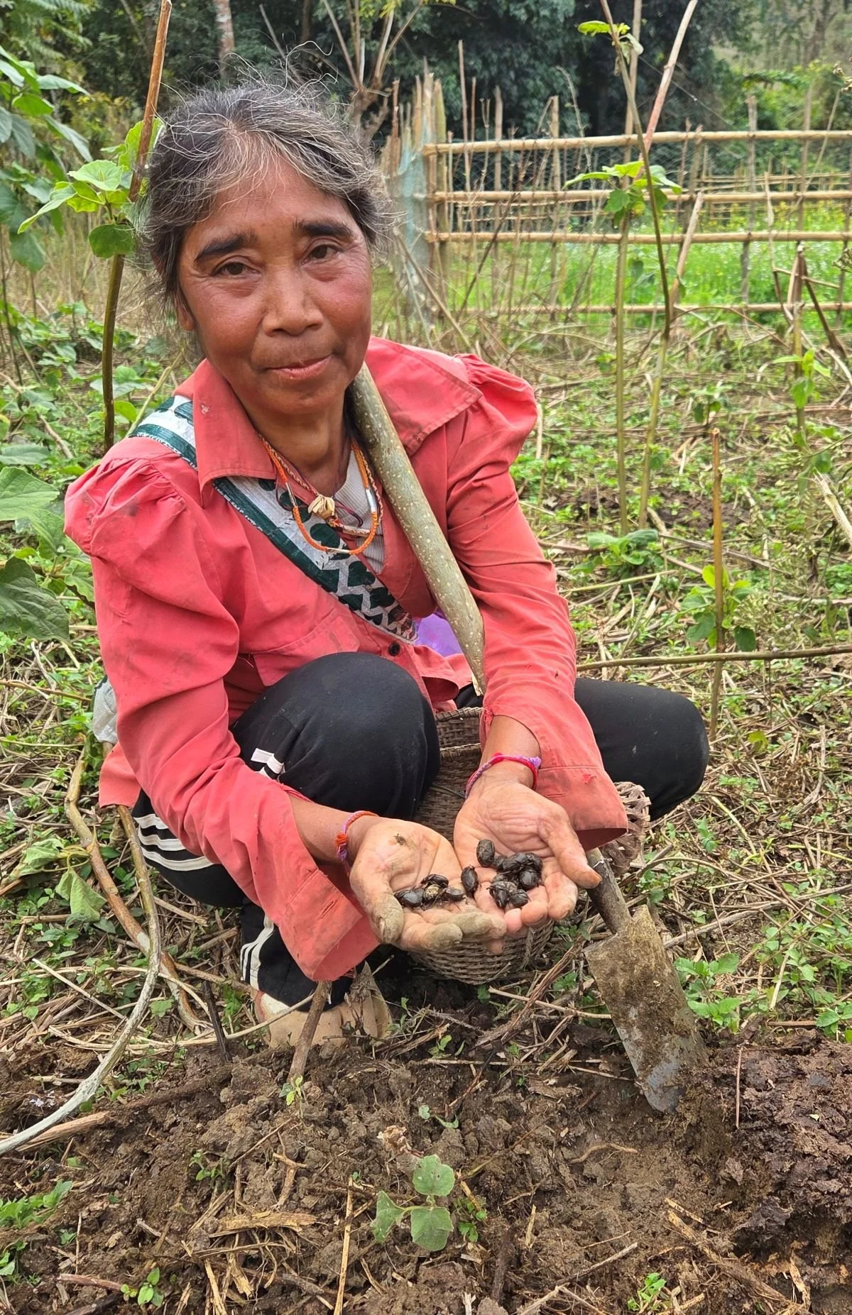 Auf dem Weg zurück begegne ich einer Frau von der ethnischen Gruppe der Karen, die sich selbst jedoch eher als „Pga K’nyau“ bezeichnen, was einfach „Mensch“ bedeutet. Sie gräbt unter Dunghaufen von Wasserbüffeln in der Erde und zeigt mir ihre Beute: Dung-Käfer. „Die schmecken gut“, erklärt unser Guide, doch auch hier verzichten wir auf eine Kostprobe.