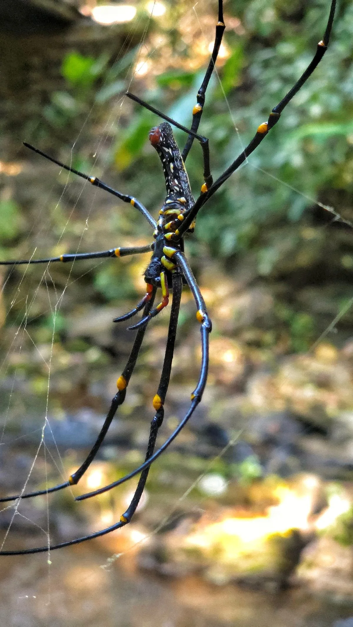 Plötzlich ein Schreckmoment: Zwischen den Ästen hängt eine Riesenseidenspinne, ihr Körper so groß wie eine Handfläche, die Beine lang und kräftig. Sie lauert auf Beute: Käfer, Vögel, Fledermäuse! Wir passen wohl nicht in ihr Schema, halten aber trotzdem lieber Abstand.