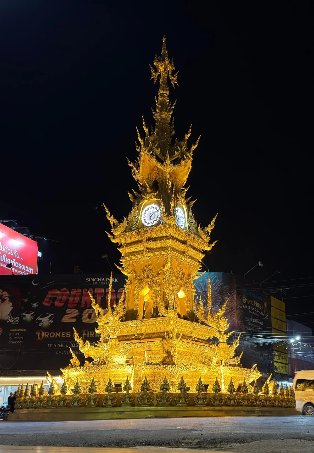 Nach so viel Erleuchtung steht zum Abschluss in Chiang Rai noch ein Profanbau auf dem Programm: der Uhrenturm im Zentrum von Chiang Rai. Er zeigt nicht nur schnöde die Uhrzeit an, sondern leuchtet im Tempelgold die Straßenachsen hinunter. Und am Abend zur Dunkelheit wechselt er in einer Lichtershow von Rot über Blau zu Gelb.