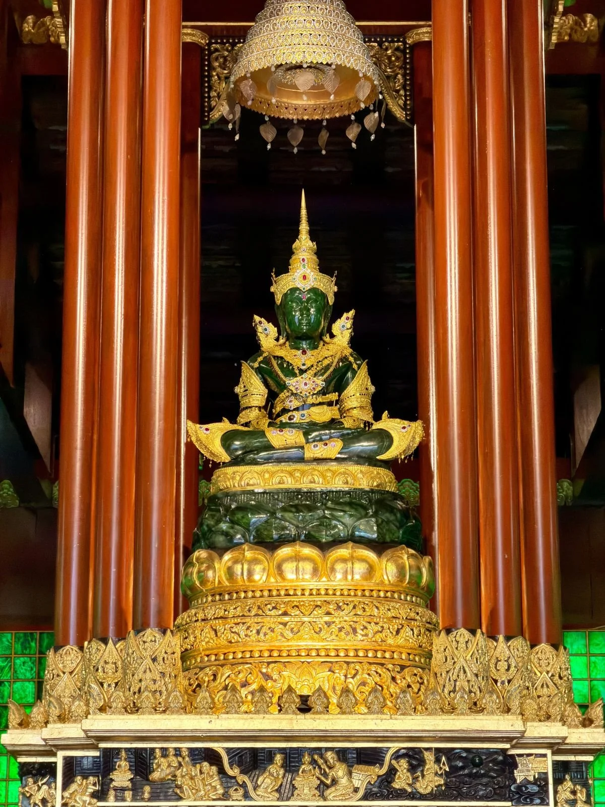 Nach so viel Show führt uns der Weg zu einer „echten“ historischen Sehenswürdigkeit. Der Tempel Wat Pra Keo beherbergt den Jade-Buddha. Bei einem Gewitter im Jahr 1434 schlug ein Blitz in die Pagode ein und brachte das Schmuckstück zwischen den Trümmern zum Vorschein. Er gilt als heiligstes Nationalsymbol und wurde deshalb nach Bangkok gebracht, sodass hier in Chiang Rai nur noch eine Nachbildung beeindruckt.