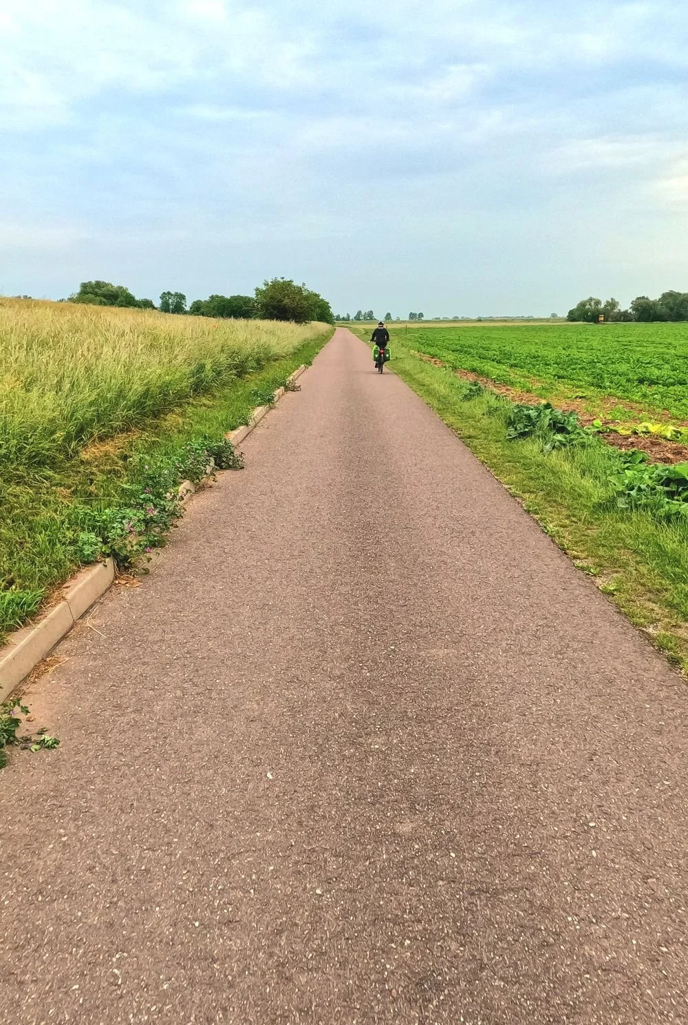 Vielleicht hat der Saale- zum Elberadweg rübergerufen: „Mach’s den nicht zu einfach!“, denn mit dem dichten Wald ist bald Schluss. Ein gewaltiger Umweg steht an und lässt uns neben LKW’s auf der Straße leiden. Als das schließlich überstanden ist, wird die Aussicht wieder schön, doch nun gibt’s Ruppelweg auf dem Deich.