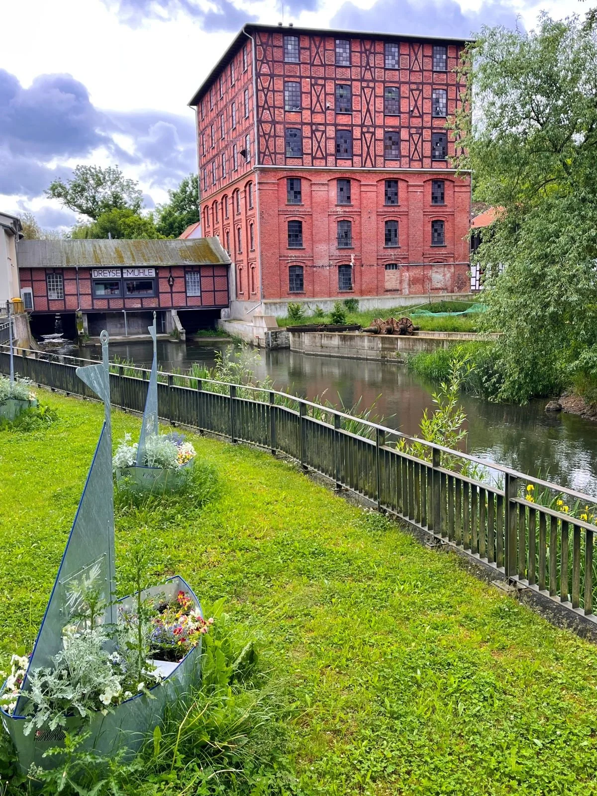 Schon bald erreichen wir Sömmerda, das nicht so ganz mit den vorherigen Schmuck-Städtchen mithalten kann. Am Stadteingang zieht jedoch die imposante Dreyse-Mühle die Blicke auf sich. Wie immer brannte die auch mal ab, steht aber nun als sechsstöckige Mahlmühle seit 1878 an der Unstrut. Immerhin 80 PS produziert das Wasserrad, inzwischen allerdings als elektrische Turbine.
