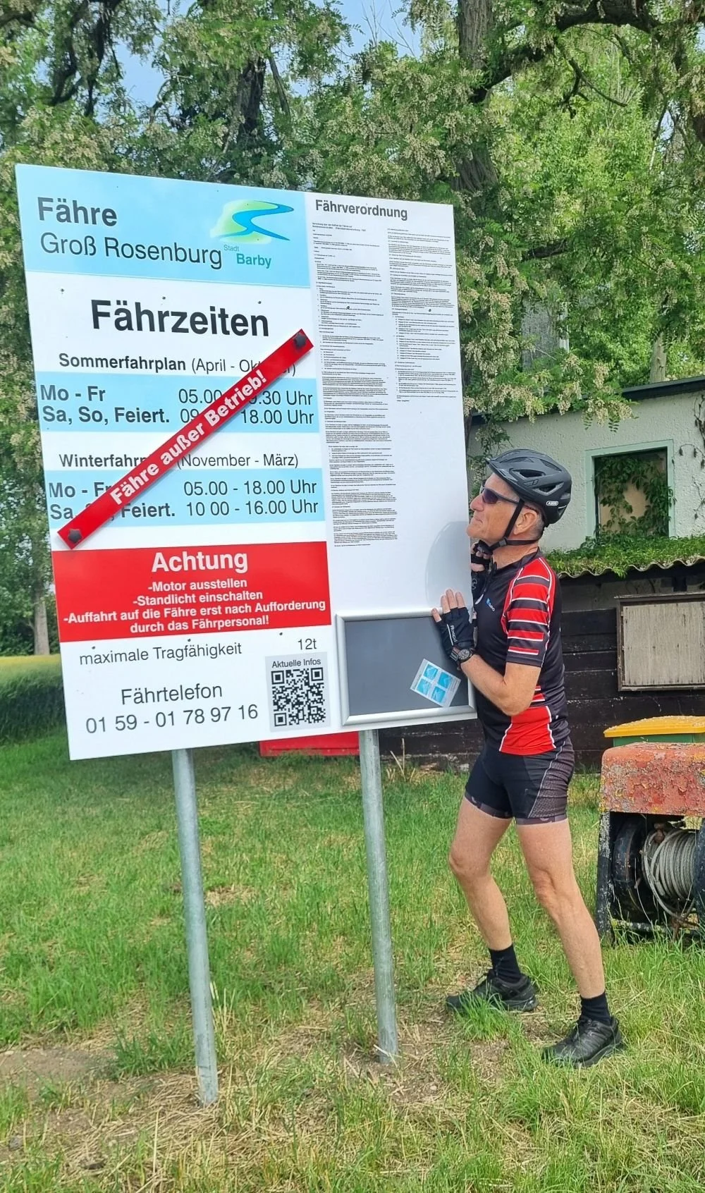 Aber sich gleich so zu rächen? Links geht der Abzweig auf die K1243 zur Saalefähre Groß Rosenburg. Sie liegt vertäut im Wasser, nur weit und breit ist kein Mensch in Sicht und ein großer roter Balken verkündet nichts Gutes.