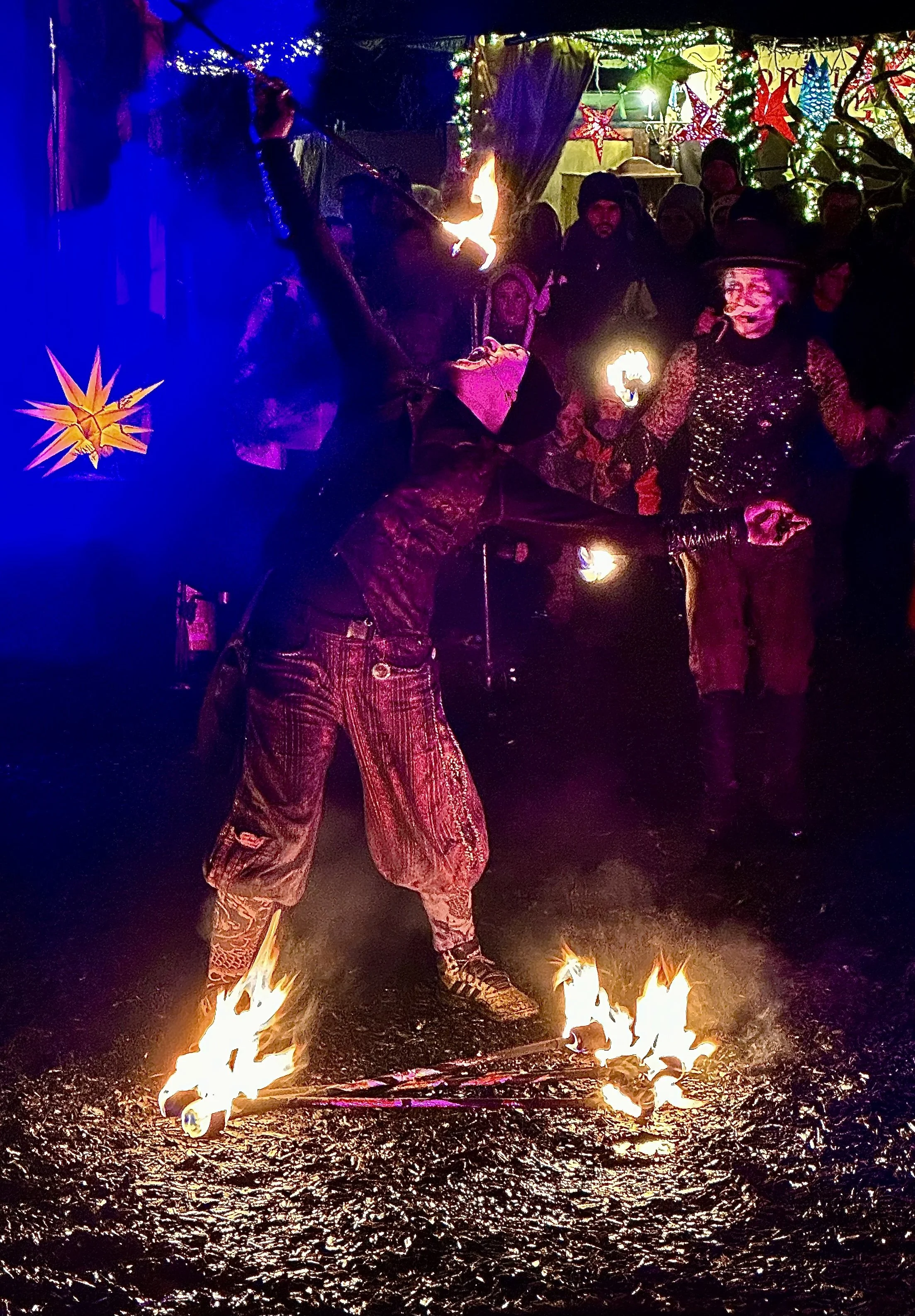Wir sind schon fast so weit, die Schritte Richtung Ausgang zu lenken, als uns wilde Schreie und Feuerschein der besonderen Art fesseln. Zwei Burschen mit stark ausgebildeten pyromanischen Neigungen präsentieren ihre Künste.